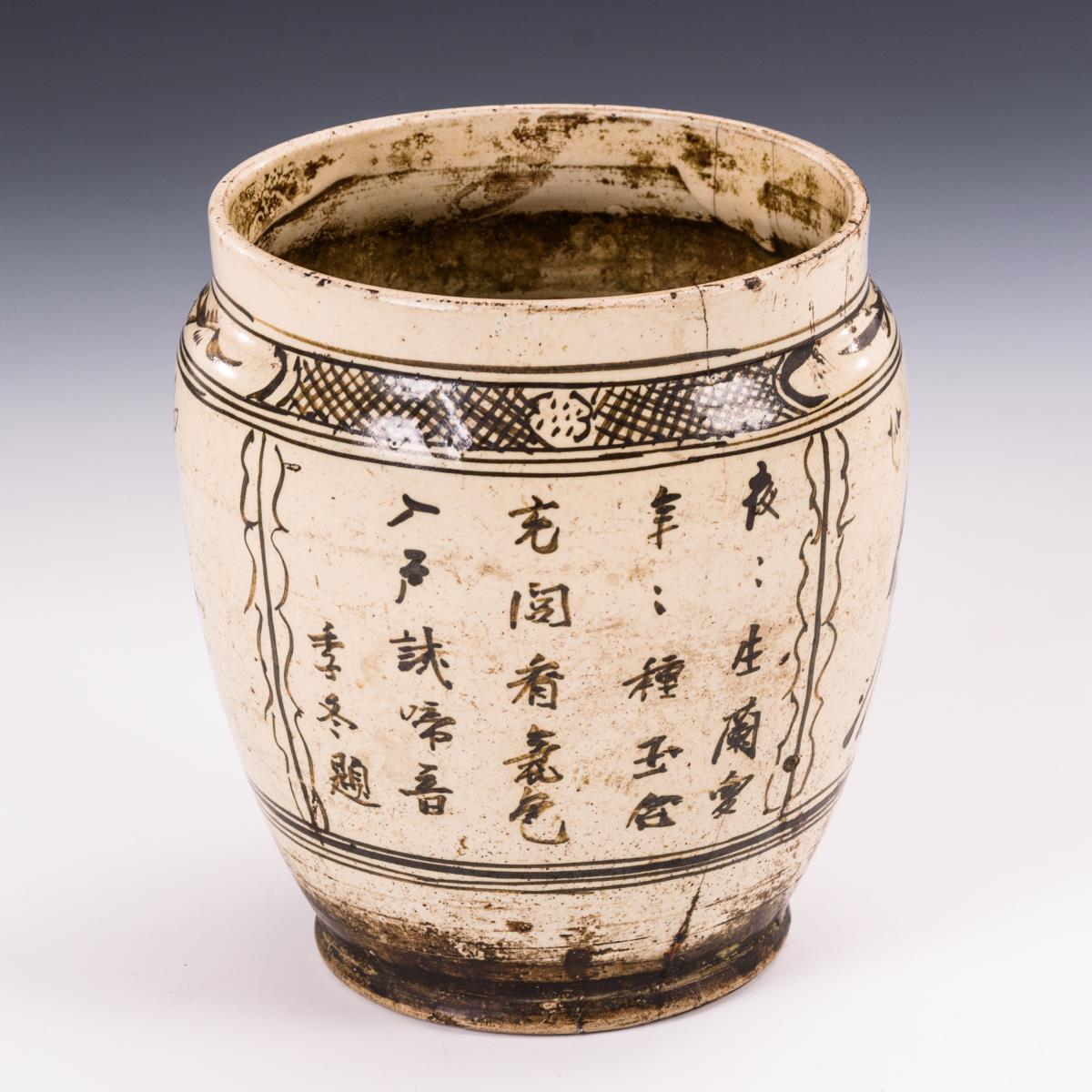 Topf mit weiter Öffnung. Bodenring sehr glatt. Zwischen stilisierter Blüte und Vogel zwei gleiche Schriftblöcke mit einem Liebesgedicht. Die Übersetzung dazu liegt handschriftlich bei. Restaurierter Riß durch Wandung und Boden.