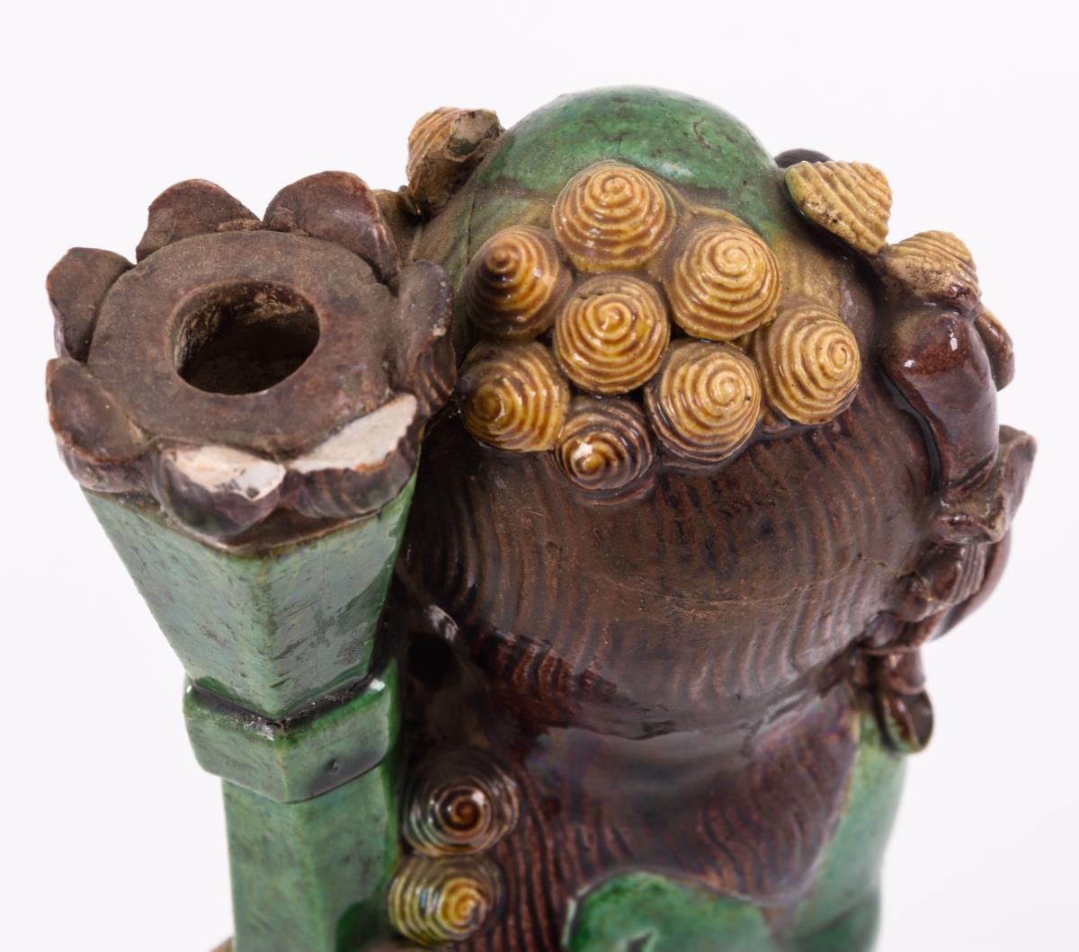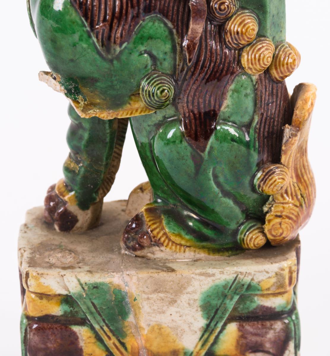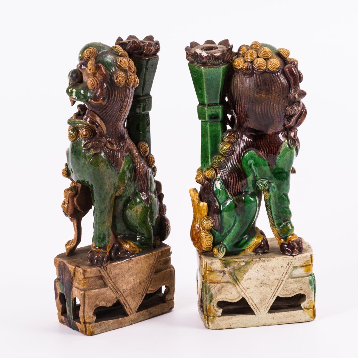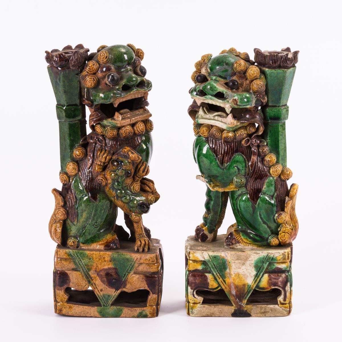 Zwei Palastlöwen auf durchbrochen gearbeitetem Sockel. Beim männlichen Löwen fehlt die Tatze mit der Kugel. Weiterhin Klebestellen und Chips an der Stele. Beim weiblichen Tier kleine Fehlstellen.