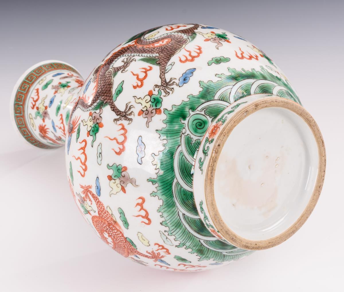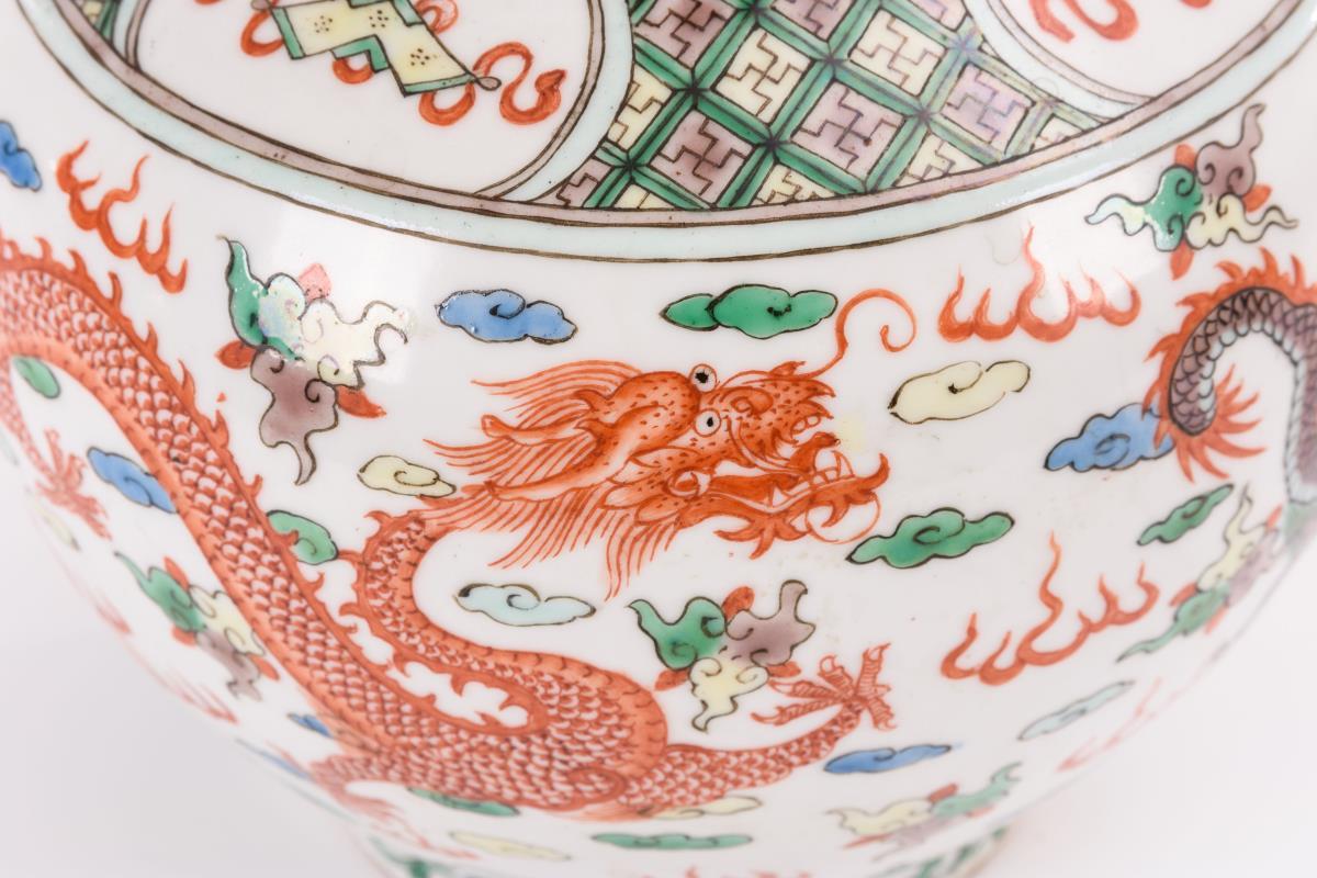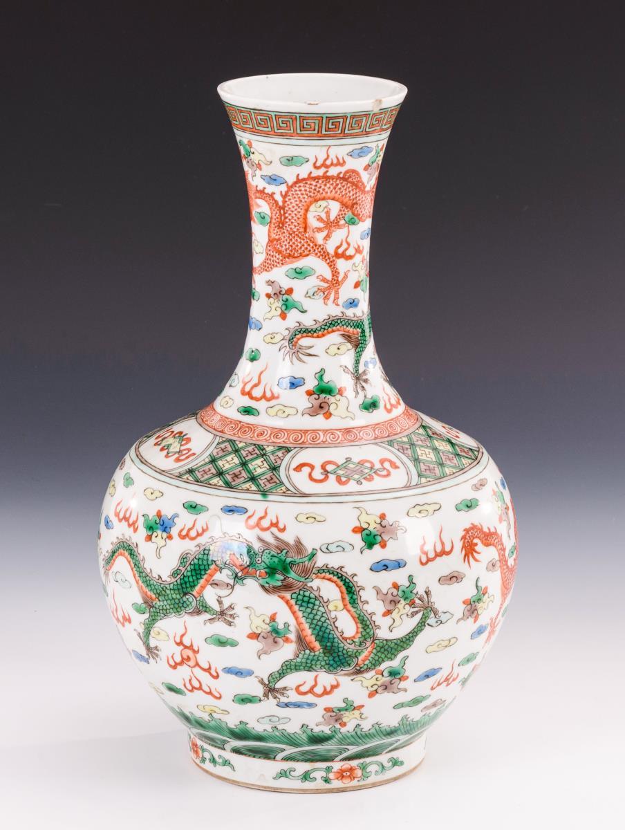 Bauchige Vase mit schlankem Hals. Feine Malerei mit Emailfarben. Verschiedene Drachen zwischen Himmel und Wasser. Oberer Rand etwas bestoßen.