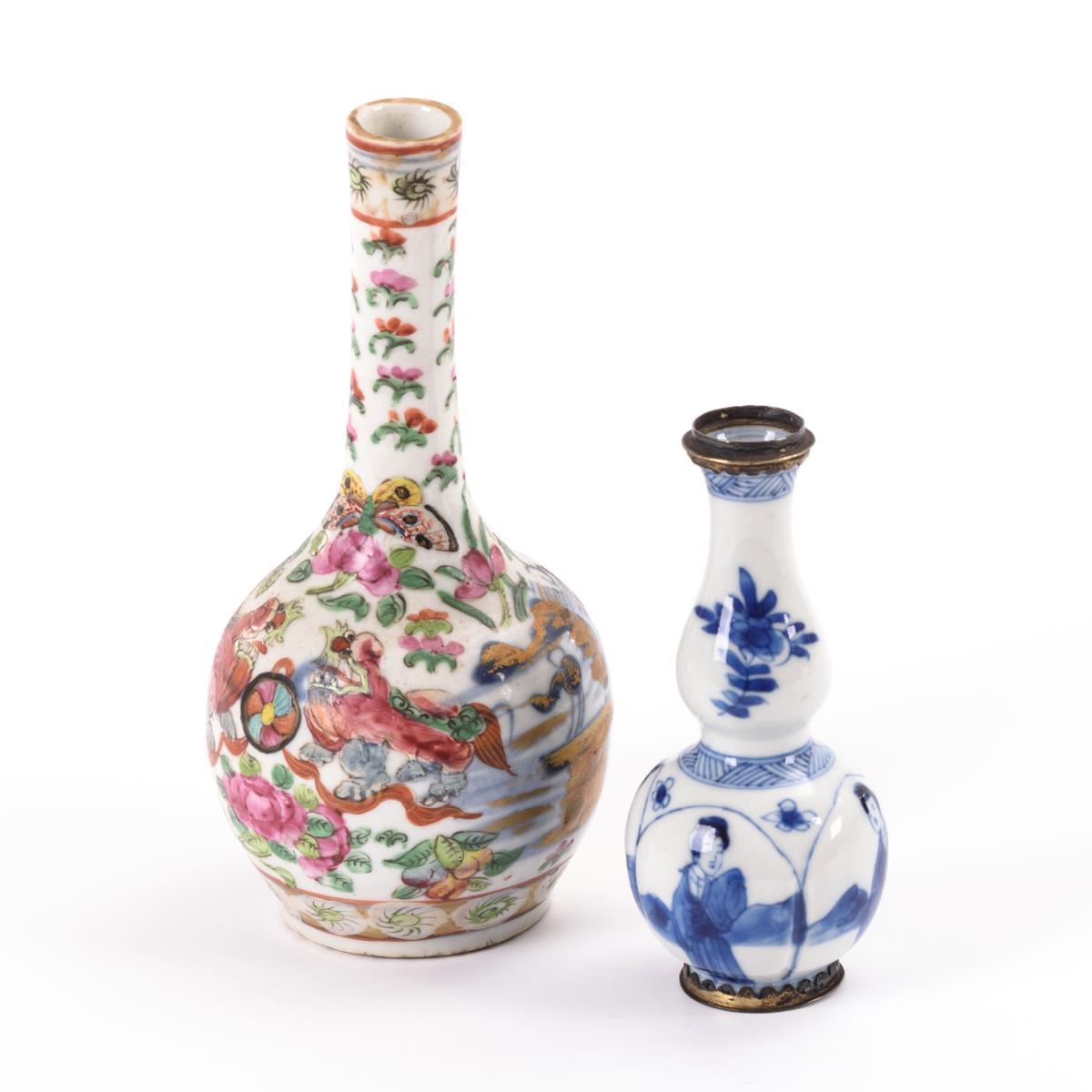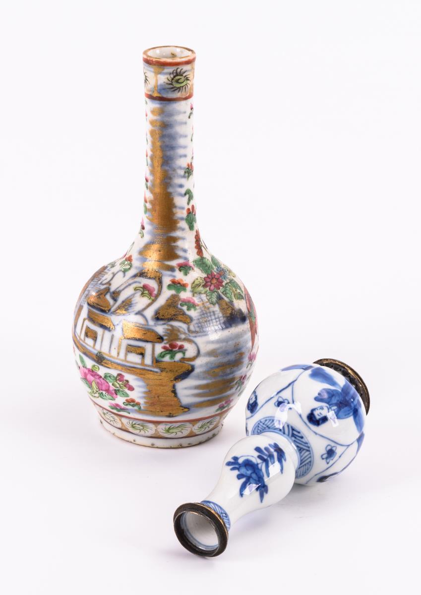 Vase mit Unterglasur-Blaumalerei. Vierpassiger Bauch mit Frauendarstellungen, schmaler Hals wiederum in Vasenform, Metallfassung oben und unten. Gemarkt. / Vase mit polychromer Fassung. Kugelbauch und produktionsbedingt leicht schrägem, schmalem Hals.