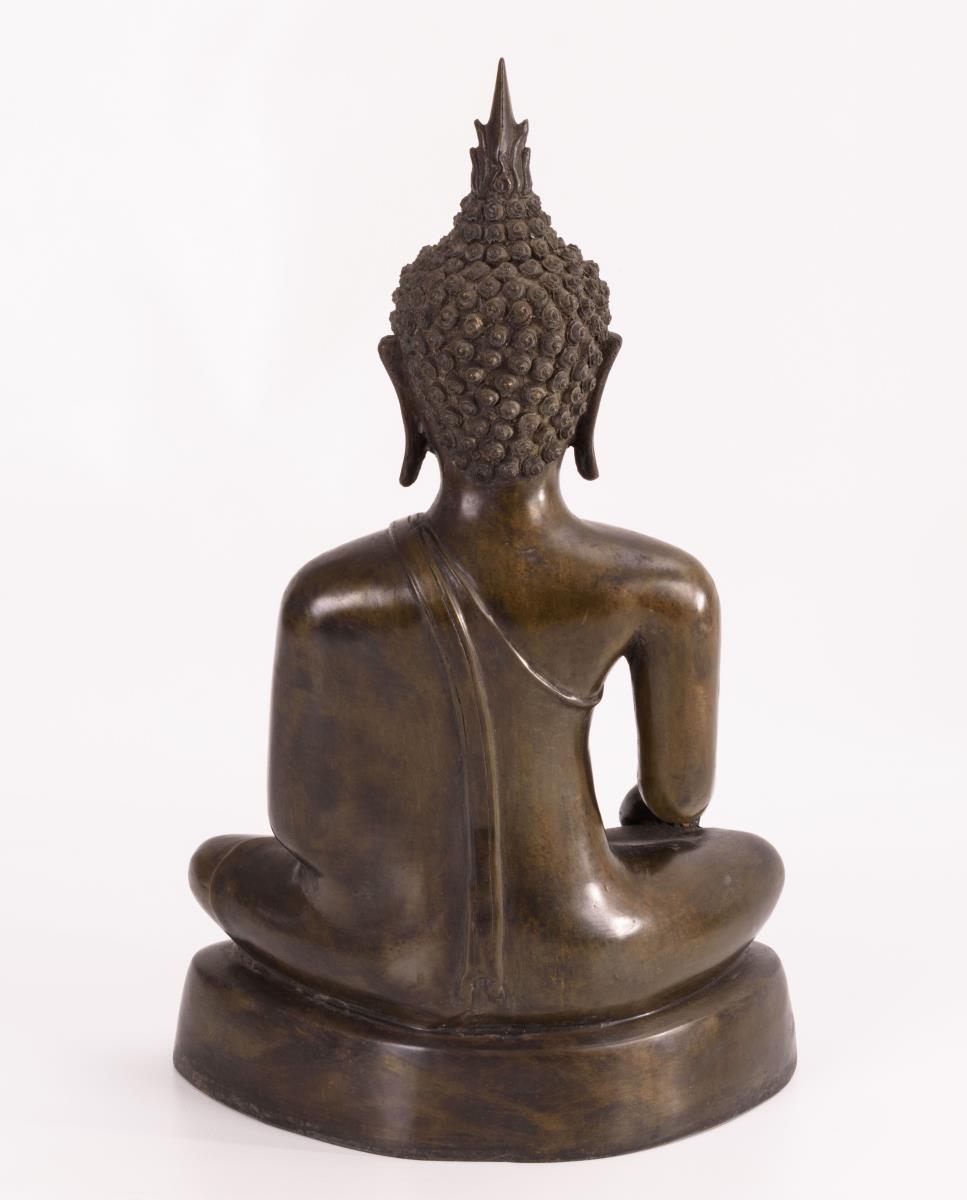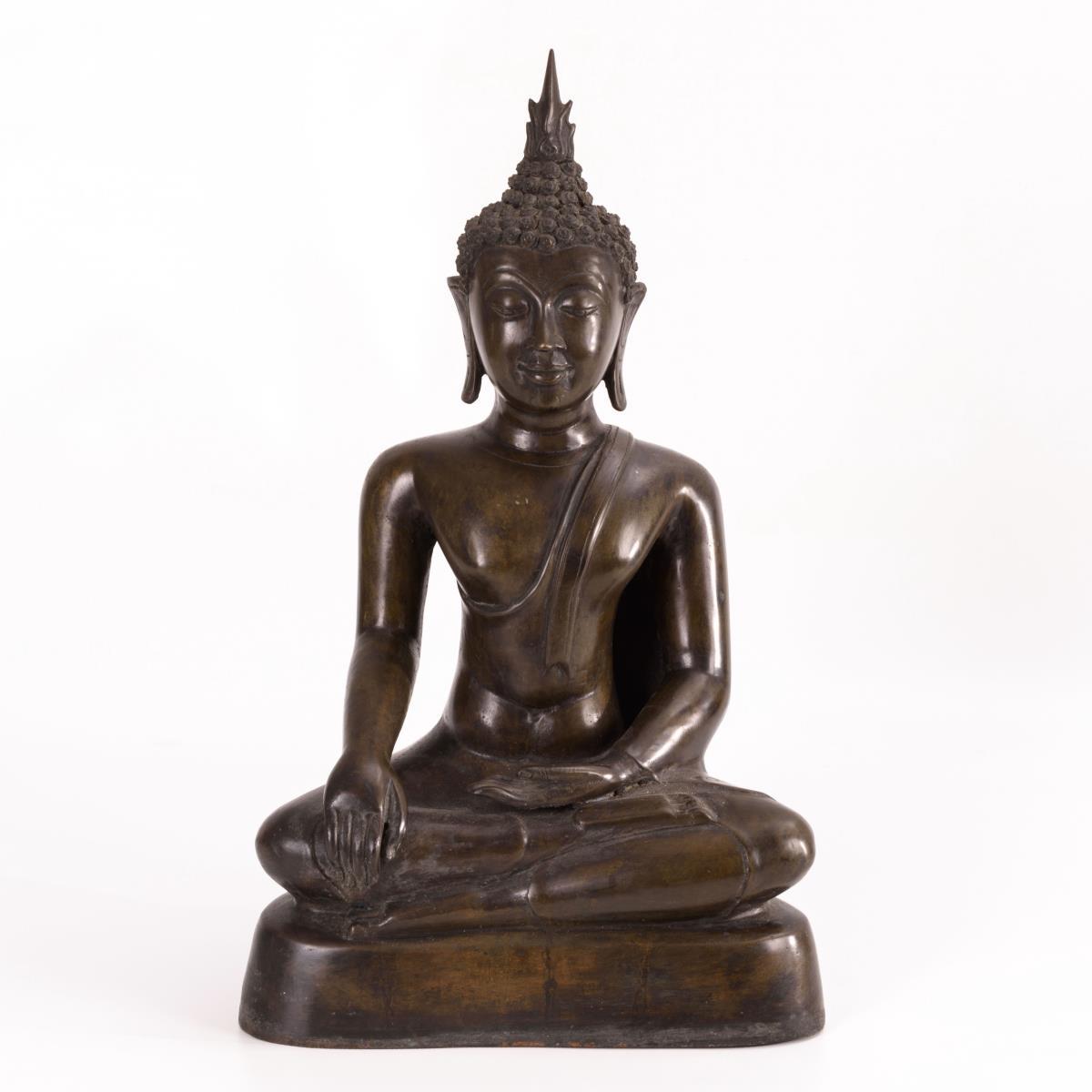 Puristische Ausführung einer im Verschränkungssitz ruhenden Figur mit dem Gestus der Meditation und der Erdberührung.