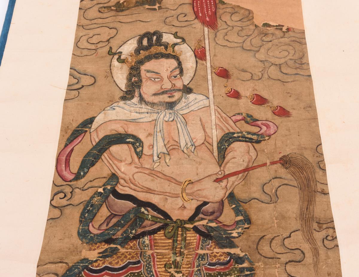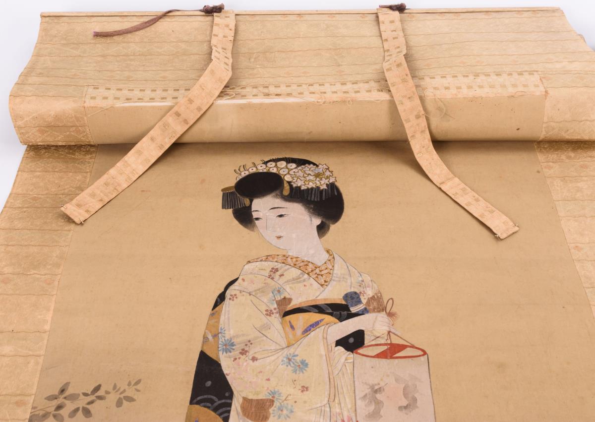 Dame im Kimono mit Laterne in der Hand und einem Päckchen im Obi. Seidenmalerei, signiert. Im Randbereich etwas verschmutzt. / Mythologische Figur mit Haarwedel und Lanze. Malerei auf Papier. Knickspuren.