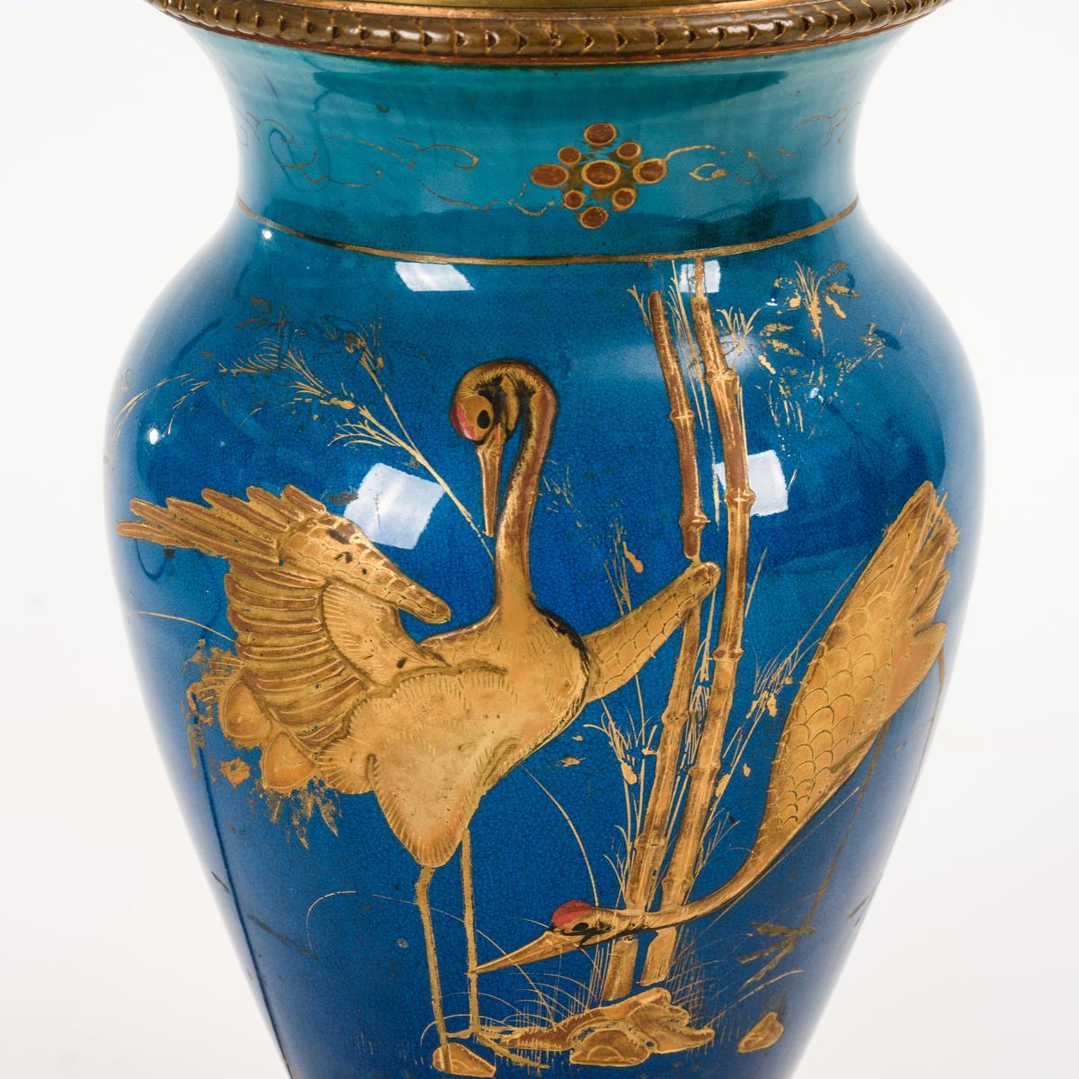 Im asiatischen Stil mit Kranichen goldstaffierte Vase, neobarock ornamentierte Montierung, Aufsatz mit 2 Schraubfassungen. Schirm fehlt, etwas berieben.