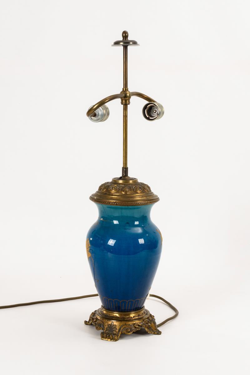 Blau glasierte Keramik, Bronze, Messing. H gesamt 66 cm.