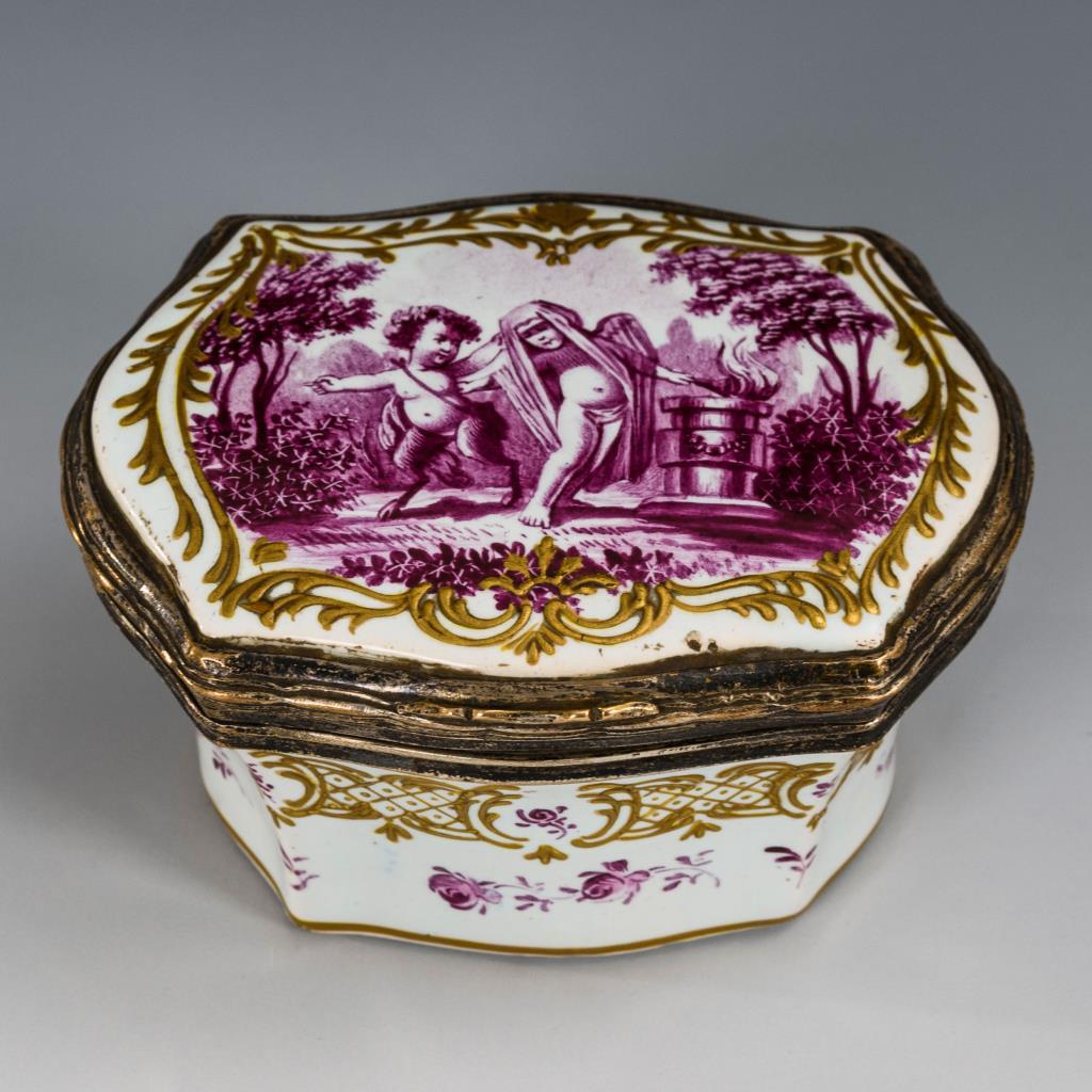 Geschweifte Dose mit umlaufenden Rocaillen und Streublüten; auf dem Deckel Amor- und Faunsknabe am Altar (Tugend und Laster) .