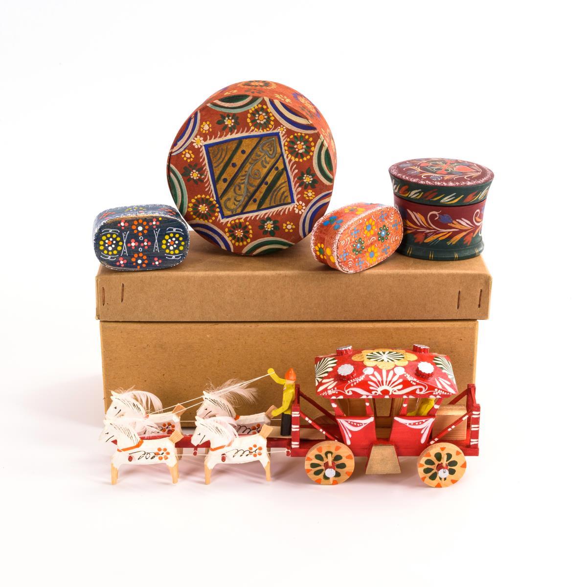 Hoheitskutsche und 4 bunte Spanschachteln. Berchtesgadener Handwerkskunst.
