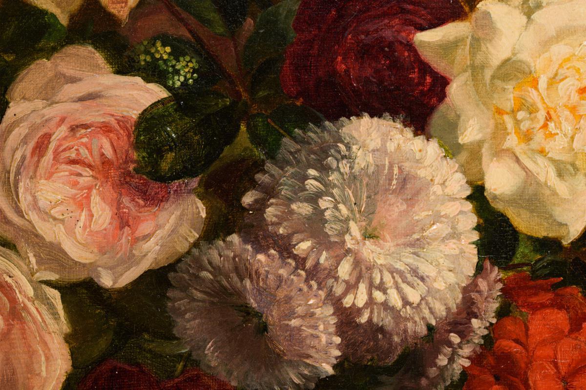 Kleiner Blumenstrauß mit Rosen in spiegelnder Glasvase auf einem Sims. Eine kleine restaurierte Stelle mit Hinterklebung.