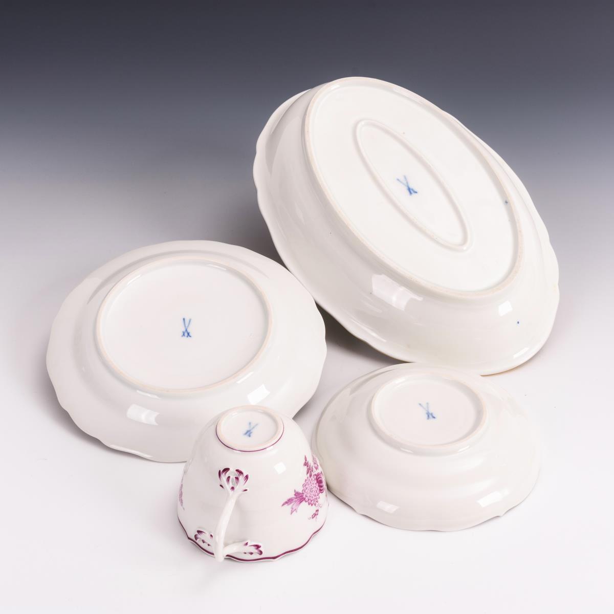 1x unterglasurblaue Malerei und Goldstaffage, 1x Purpurdekor. Tasse (H 6,5 cm), Untertasse (Ø 14,5 cm), Teller (Ø 18 cm) und Schale (L 27 cm).