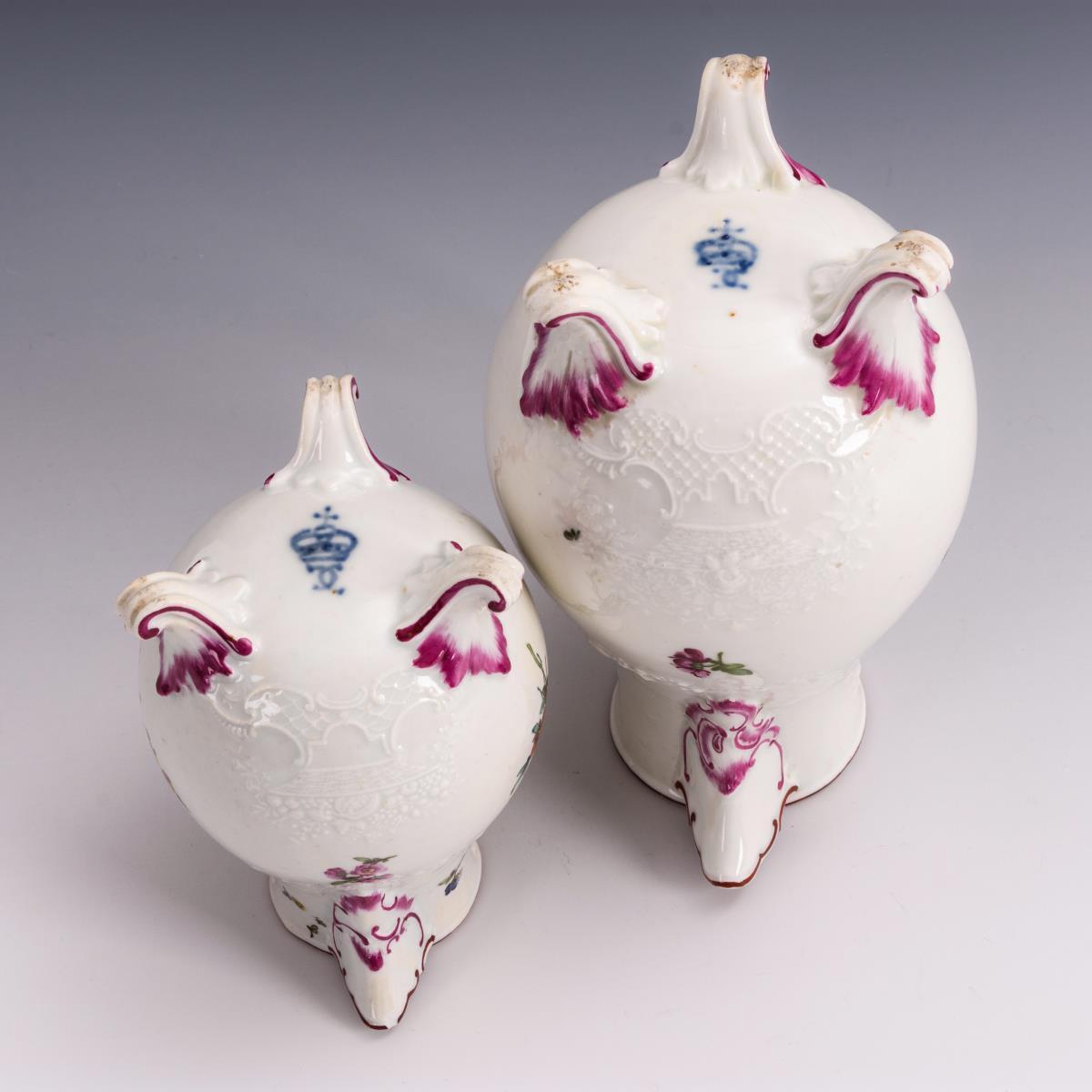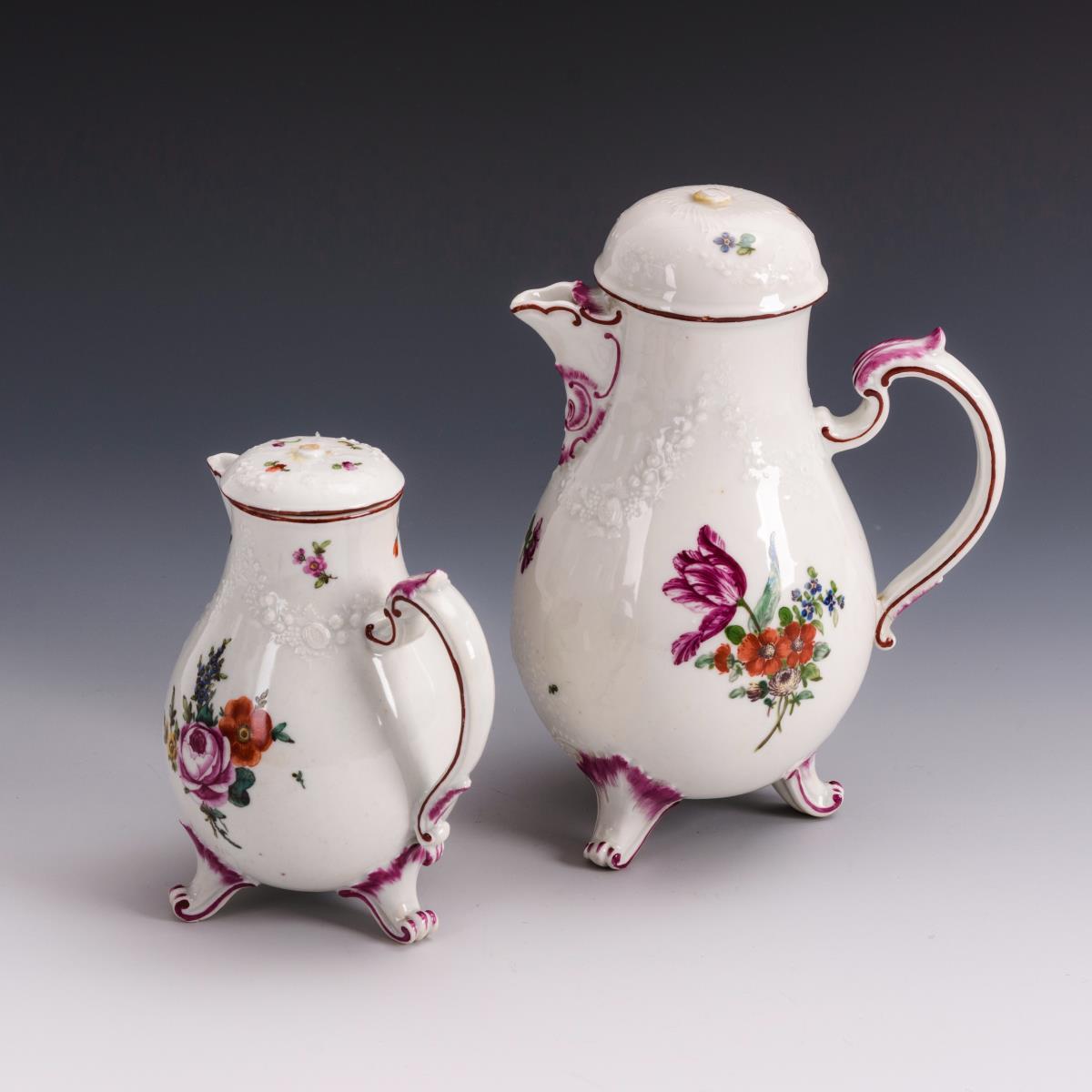 Birnkannen mit Relieffestons, drei Füßen, Rocaillehenkel und -schneppe. Beide Deckel ohne Knauf, Chip an 1 Schneppe und 1 Deckelrand.