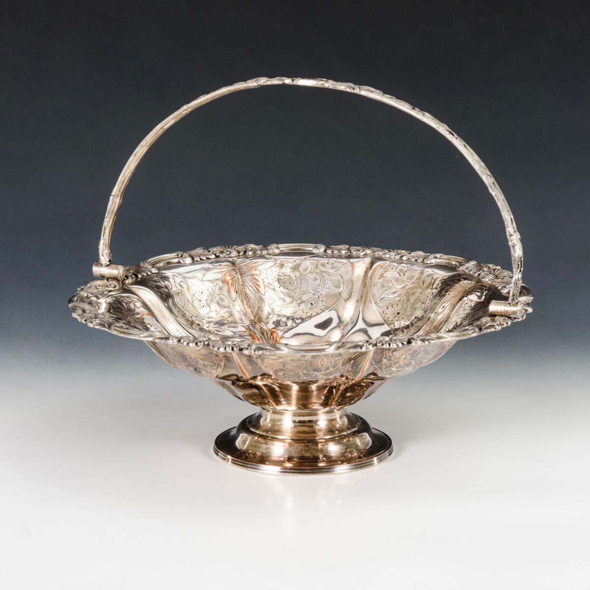 Runde Fußschale mit Blütendekor und beweglichem Bügelhenkel. Versilberung teils stark berieben.