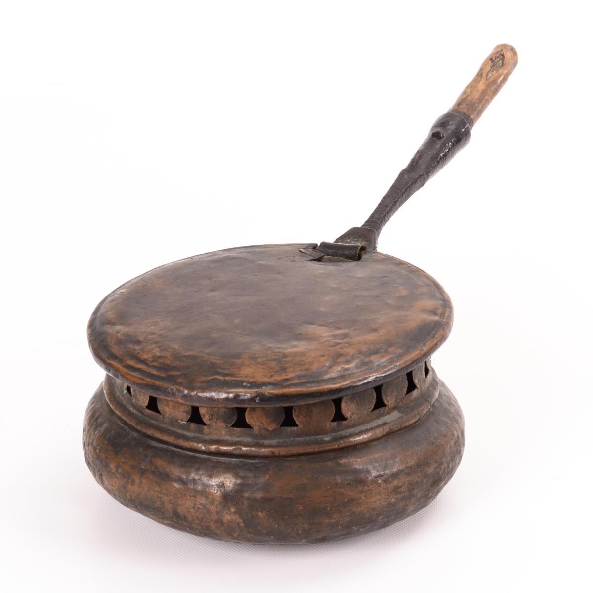 Aus einem dickwandigen Stück getriebener Bettwärmer mit Á-Jour-Scheibenfries und Scharnierdeckel; jeweils mit gebördeltem Rand. Angenietete Eisenhalterung mit Holzgriff. Ausbruch am Deckel, Alters-/Gebrauchsspuren.