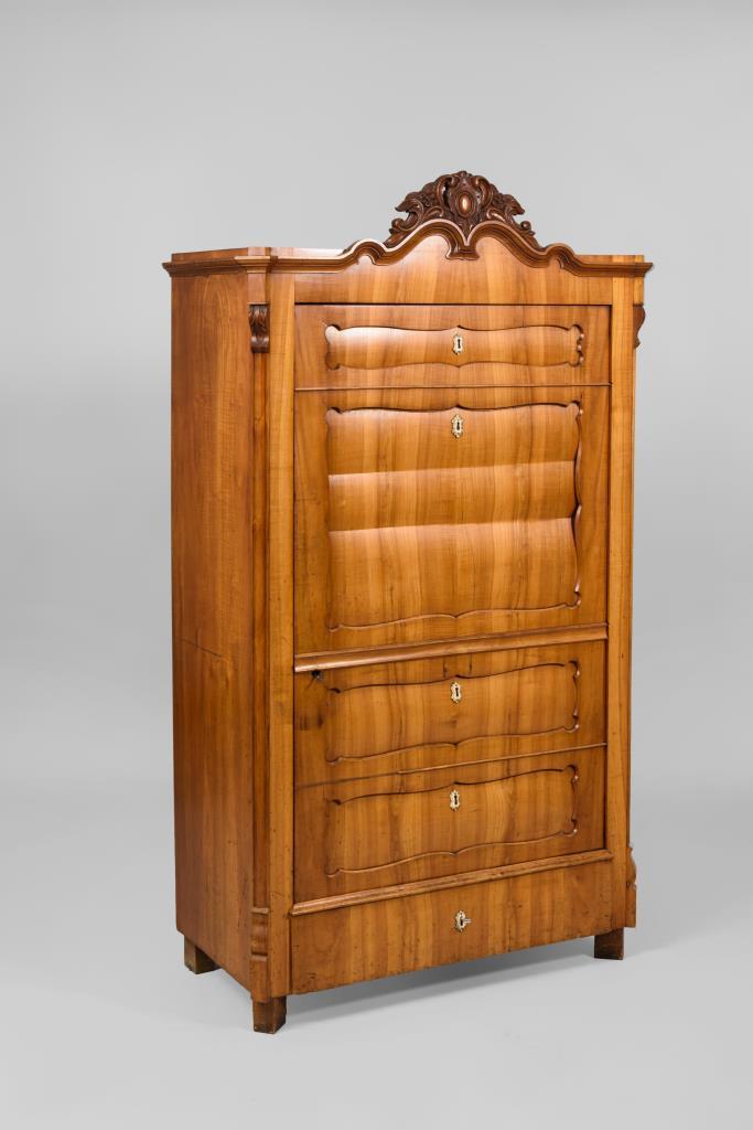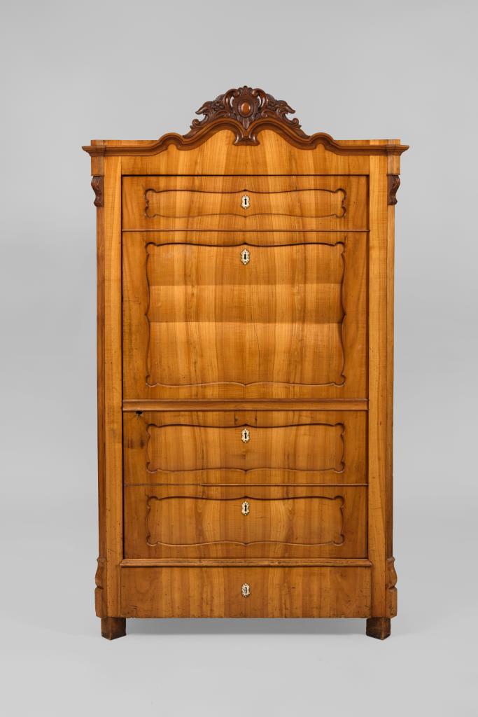 Als Schreibschrank gestalteter Blenderschrank mit Kartuschenfüllung und Rocaillenbekrönung, 1 Sockelschub; innen 4 Einlegeböden. Inaktiver Anobienbefall, Alters-/Gebrauchsspuren.