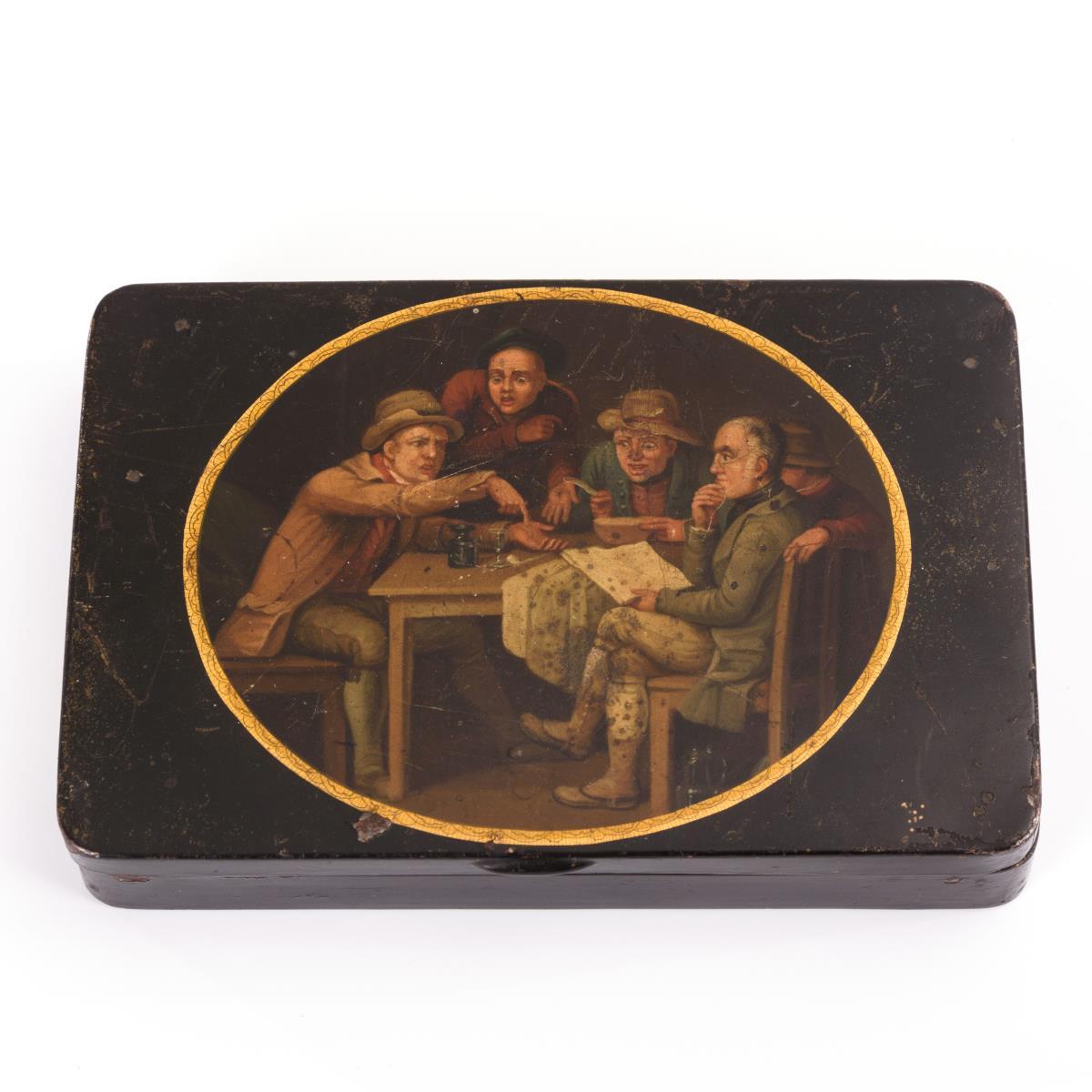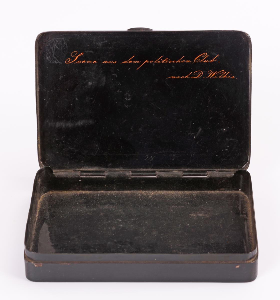Flache Quaderdose; auf dem Scharnierdeckel ovale Szene mit disputierenden Herren nach David Wilkie. Einige Alters-/Gebrauchsspuren.