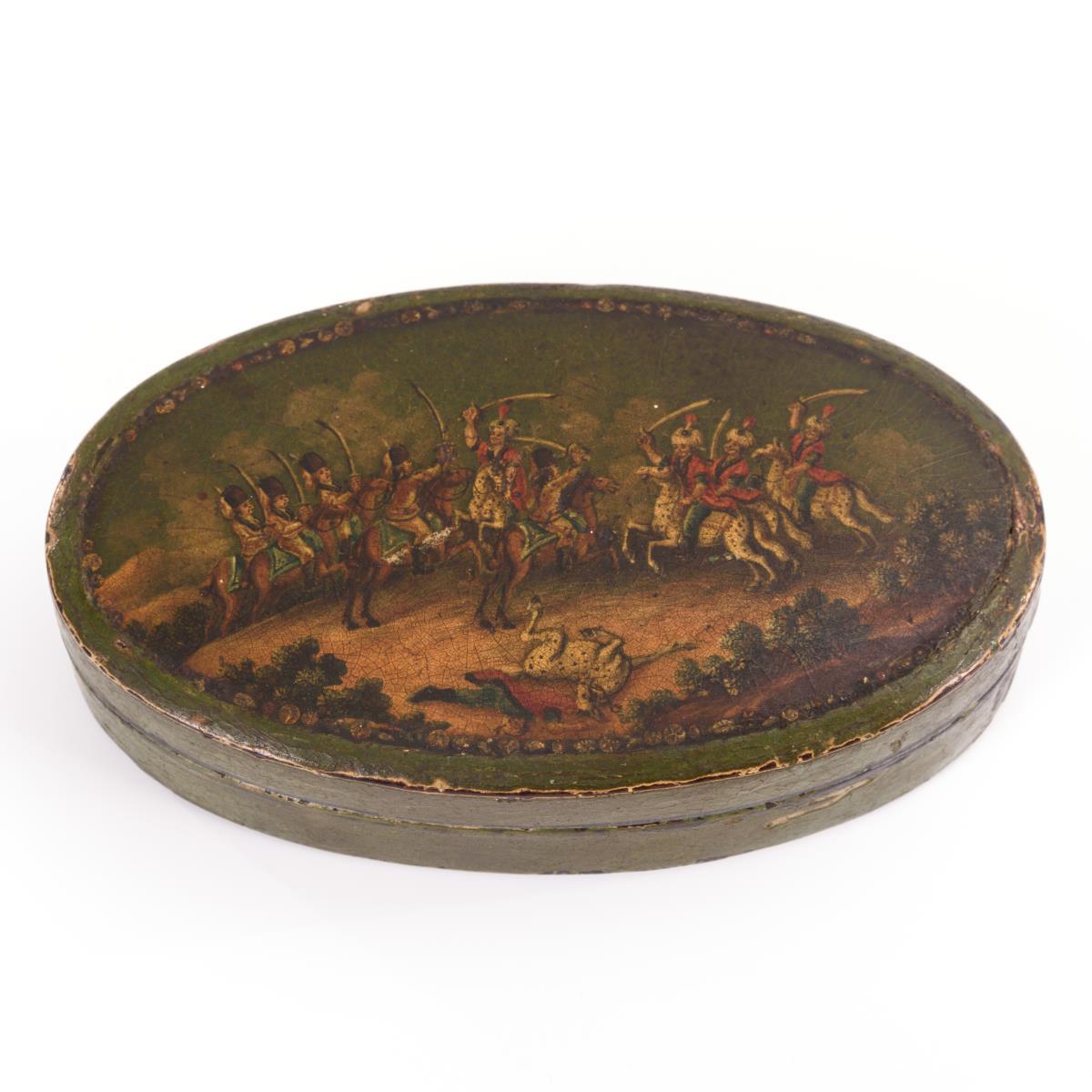 Ovale Dose; auf dem Passdeckel Reiterschlacht zwischen Husaren und Türken (Schlacht am Kahlenberg 1683?). Alters-/Gebrauchsspuren.