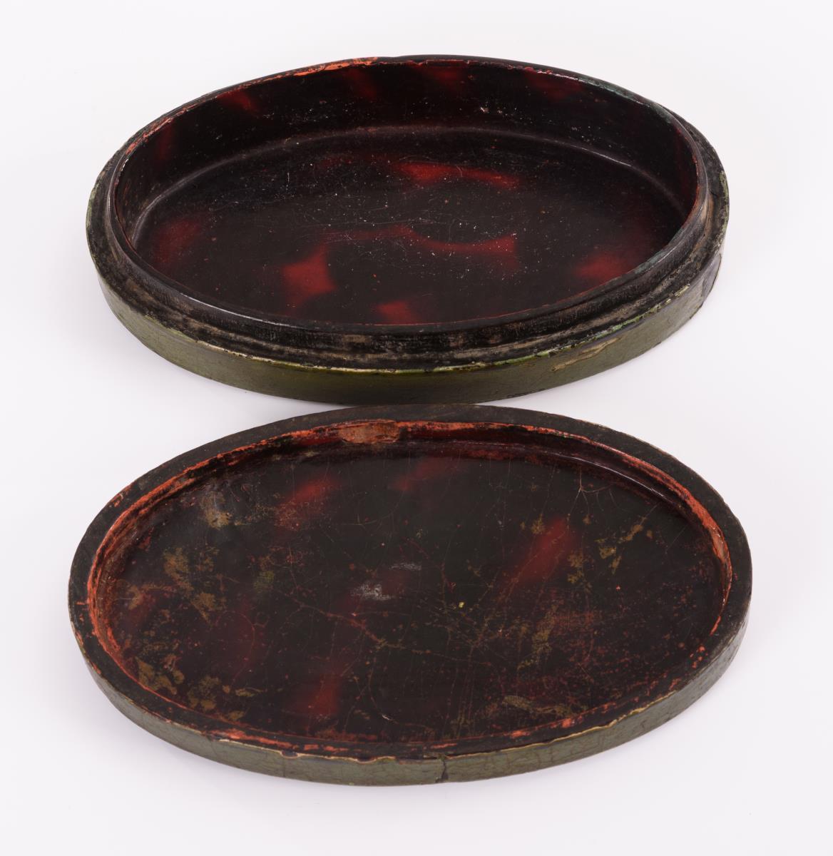 Papiermaché grün lackiert, innen Schildpattimitat-Lack, Deckel polychrom bemalt. 3,5 x 13 x 8 cm.