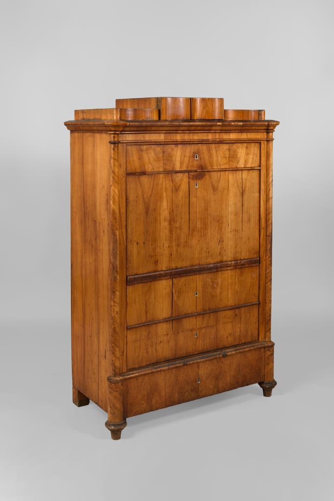 Schlichter Blenderschrank in Form eines Sekretärs, Kopfteil mit getreppt-geschwungenem Giebel und verdecktem Schub; Innenteil ohne Einlegeböden. Restaurierungsbedürftig.