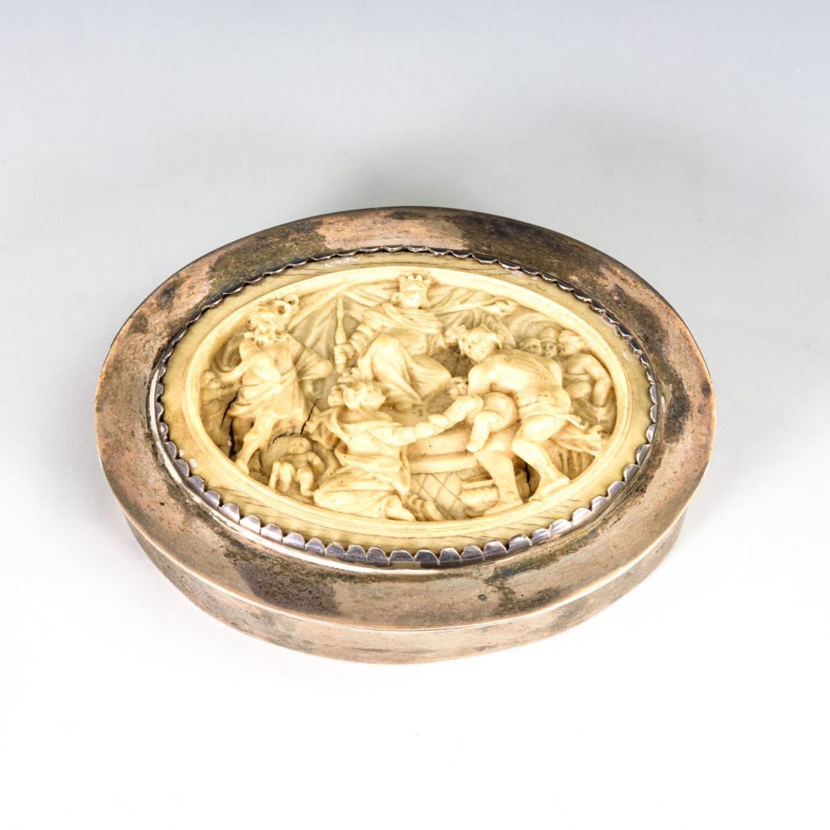 Ovales Döschen mit Darstellung des Kindermordes durch Herodes auf dem Steckdeckel. Gebrauchsspuren, Trockenrisse im Relief.