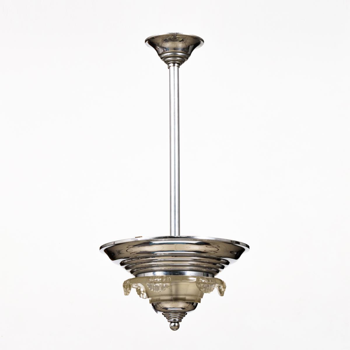 2-flammige Hängelampe mit gerilltem, trichterförmigem Schirm und formgepresstem Glas. An Lampenstab mit Glockenbaldachin. Alters-/Gebrauchsspuren, Metall mit leichten Korrosionsspuren.