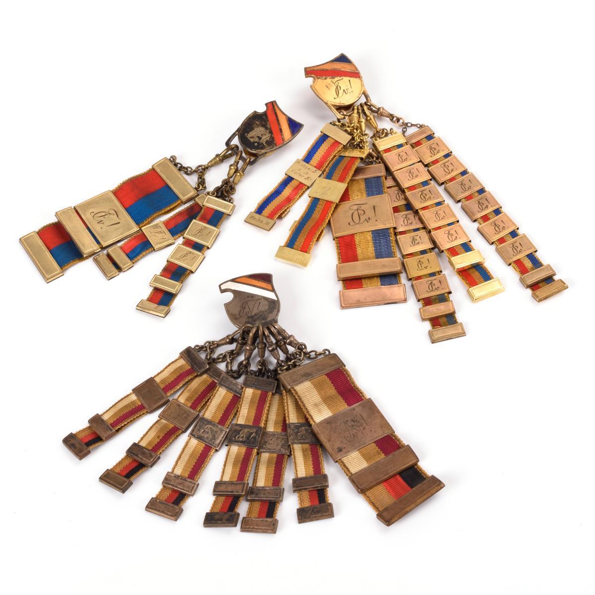 An 3 Klipps mit Email-Verbindungsfarben und graviertem Zirkel je studentische Wein- und Bierzipfel mit Schiebern. Alters-/Gebrauchsspuren.