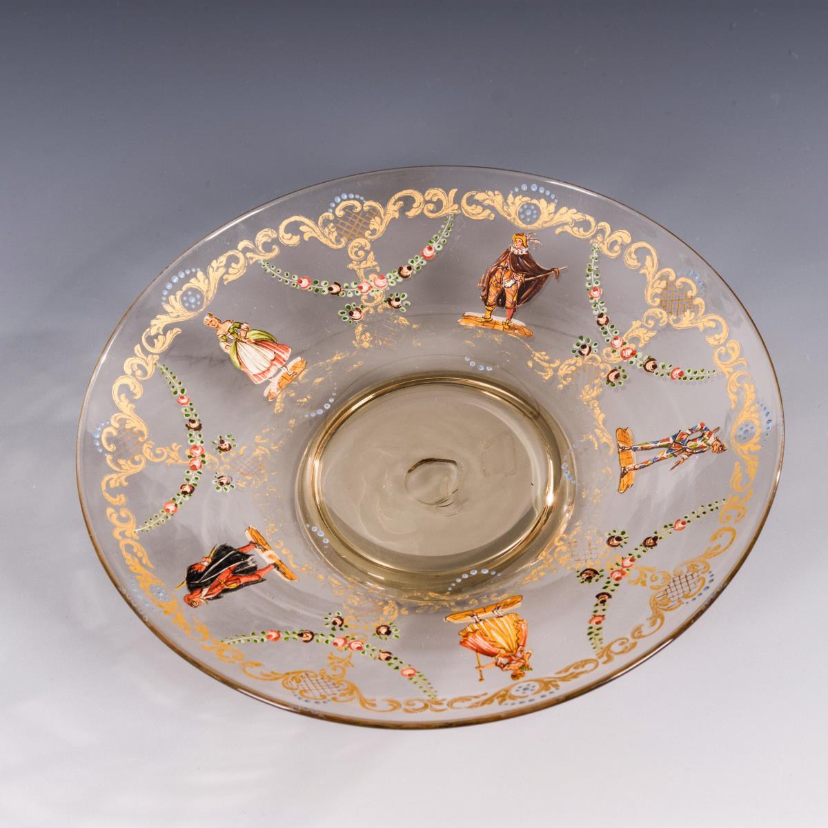 Kraterschale (H 6 cm) und Untertasse (Ø 18,5 cm). Bemalt mit Figuren der Commedia dell'arte. Etwas berieben.