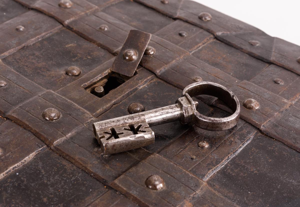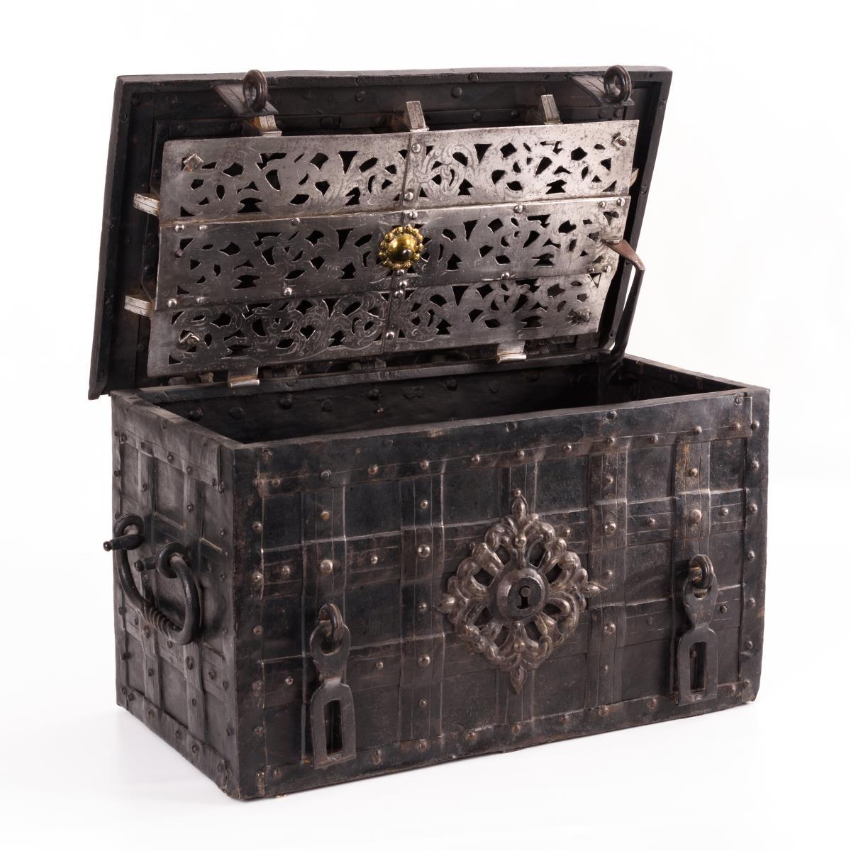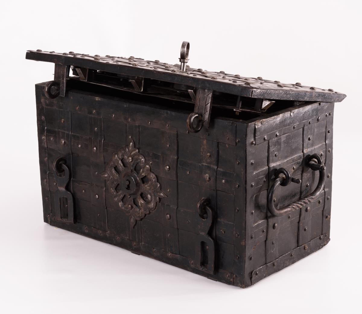Allseits und auf dem Scharnierdeckel mit dichter Bänderung versehene "Kriegskasse". An den Seiten tordierte Tragegriffe, in der Front 2 Anlegen, auf dem Deckel das verdeckte Schlüsselloch.