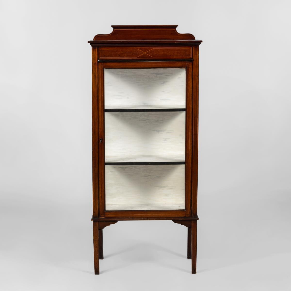 3-seitig verglastes Schränkchen mit geschweifter Bekrönung und teils hellen Fadeneinlagen, auf 4 Pfeilerbeinen. Leichte Alters-/Gebrauchsspuren, verglaste Rückwand defekt und durch hellen Stoff ergänzt.