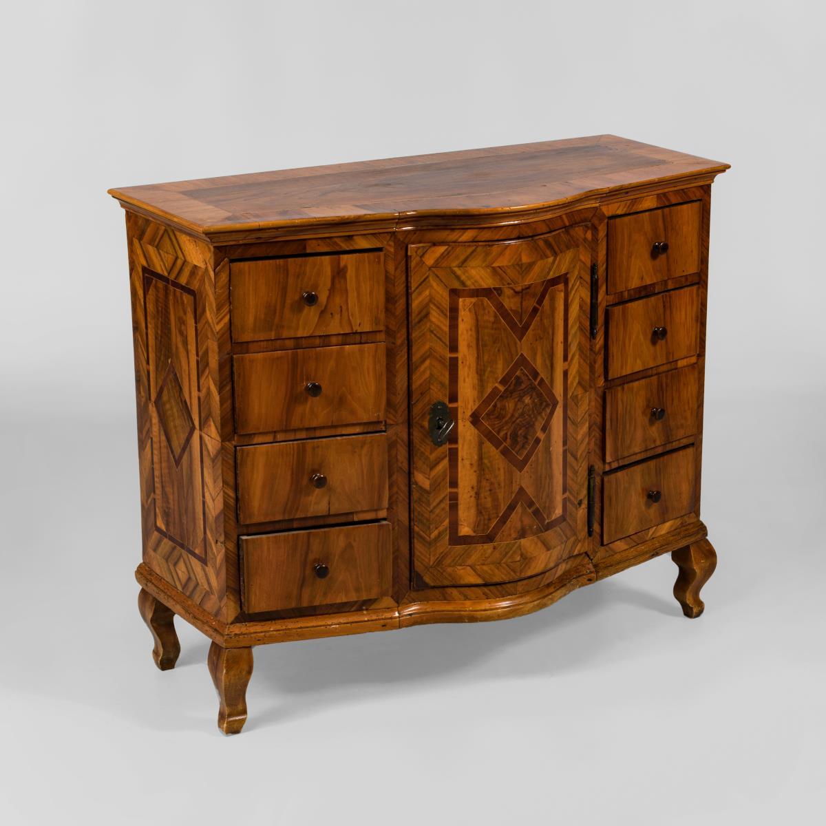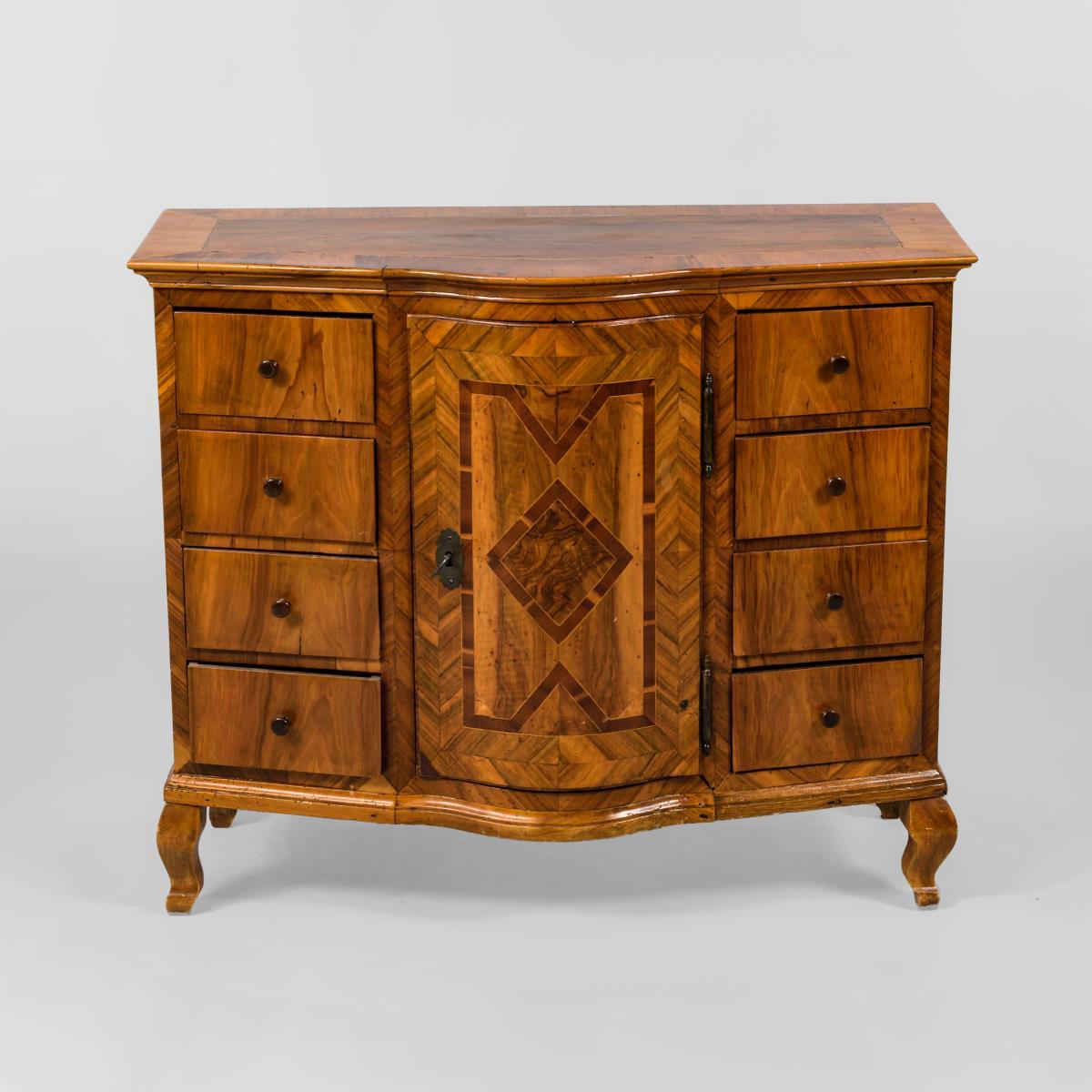 Halbschrank mit leicht gewölbter Mitteltür, flankiert von je 4 kleinen Schüben, dekoriert mit Maser- und Spiegelfurnier sowie Bandmarketerien. Auf geschwungenen Füßen. Alters-/Gebrauchsspuren, restauriert, Furnier mit kleinen Defekten, inaktiver Anobienbefall.