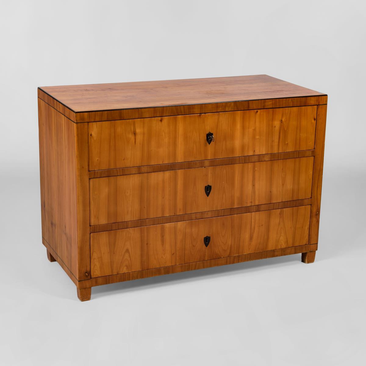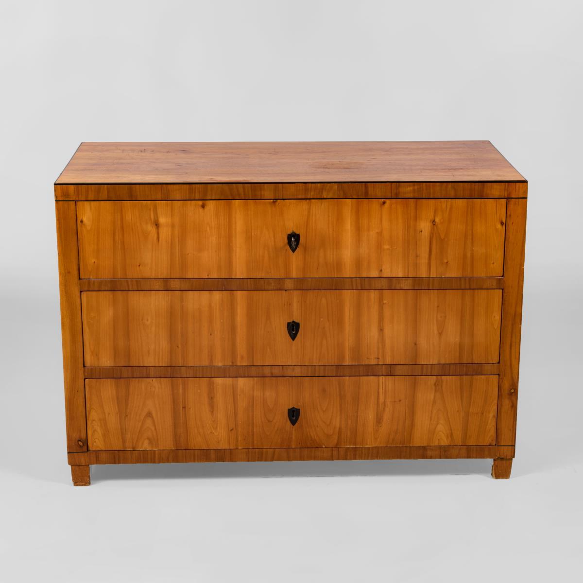 3-schübige Kommode mit ebonisierten Kanten und Schlüsselschildern. Alters-/Gebrauchsspuren, Furnier mit kleinen Defekten und Trockenrissen.