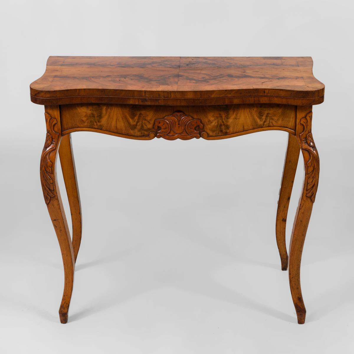 Spiel- und Konsoltisch mit geschwungenem Gestell. Tischplatte mit Drehklapp-Mechanismus und Zargenfach, verziert mit heraldischen Schnitzereien und Maserholzfurnier. Alters-/Gebrauchsspuren, inaktiver Anobienbefall, 1 Bein mit Defekt.