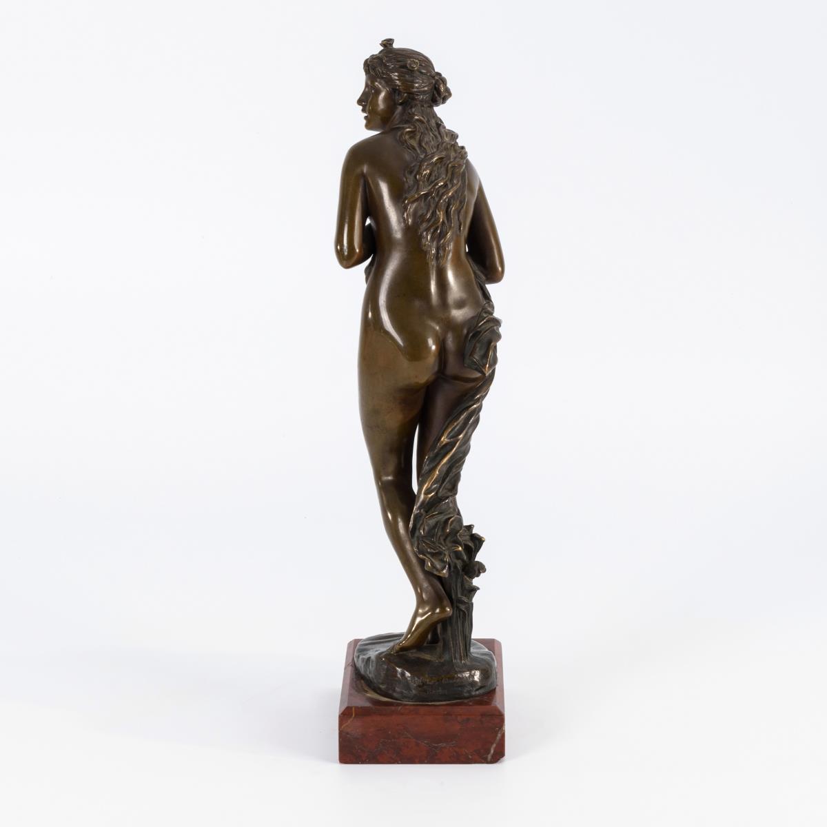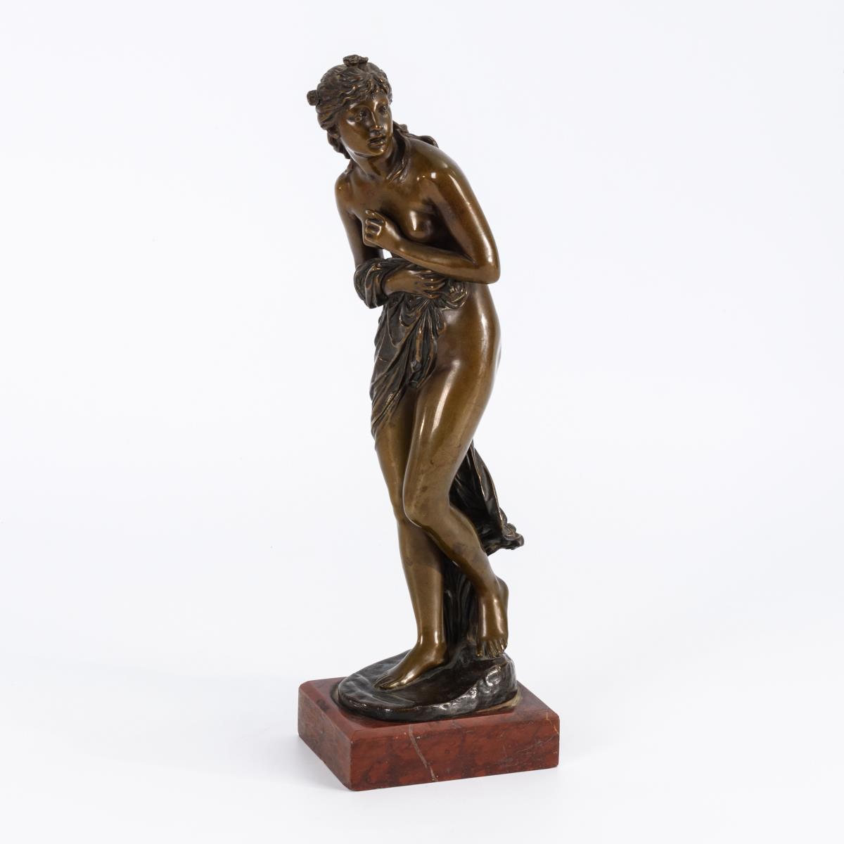 An den antiken Typ einer Venus pudica angelehnte Gestaltung der Frau mit halb herabgelassenem Tuch. Kleinere Abplatzer am Sockel, sonst wenige Alters-/Gebrauchsspuren.