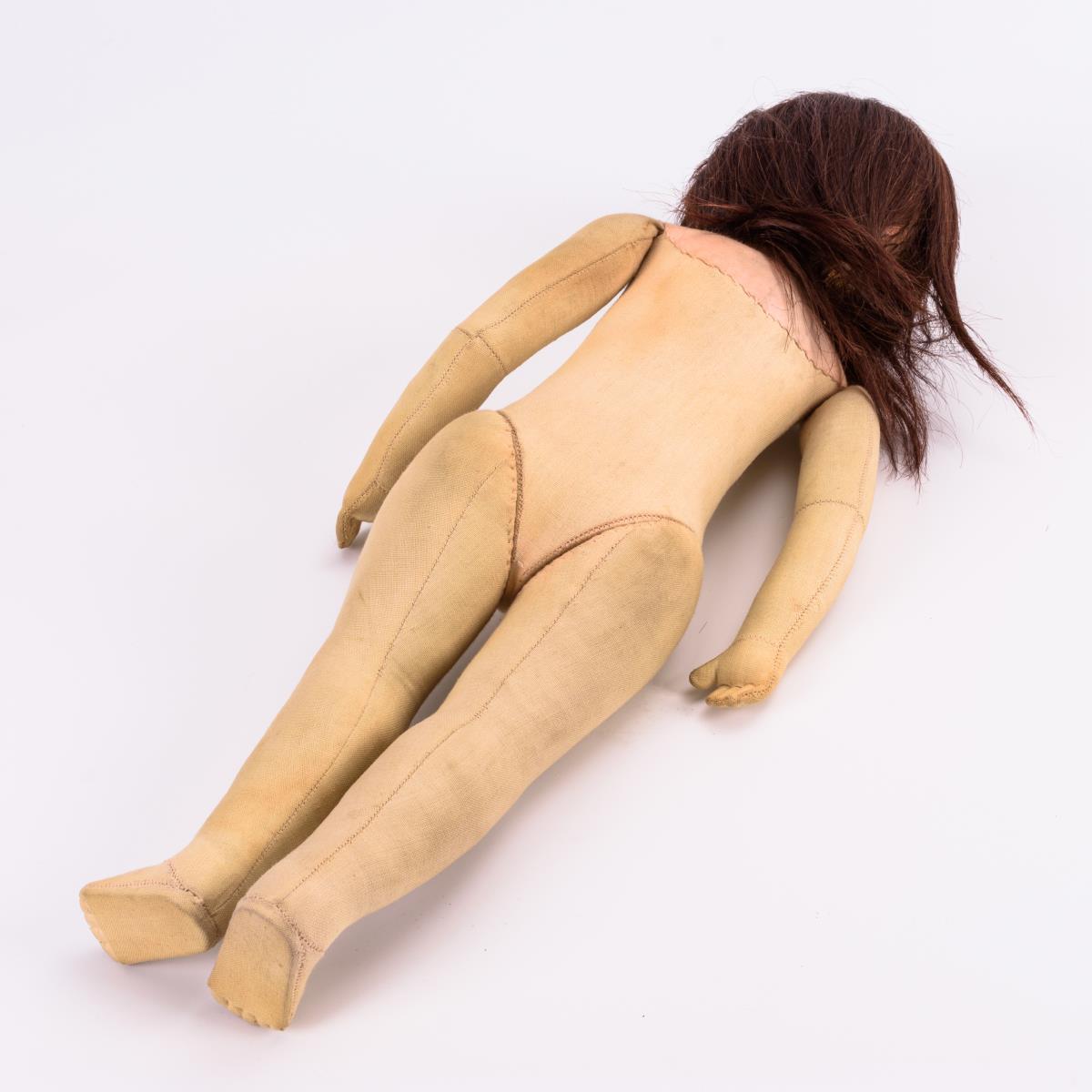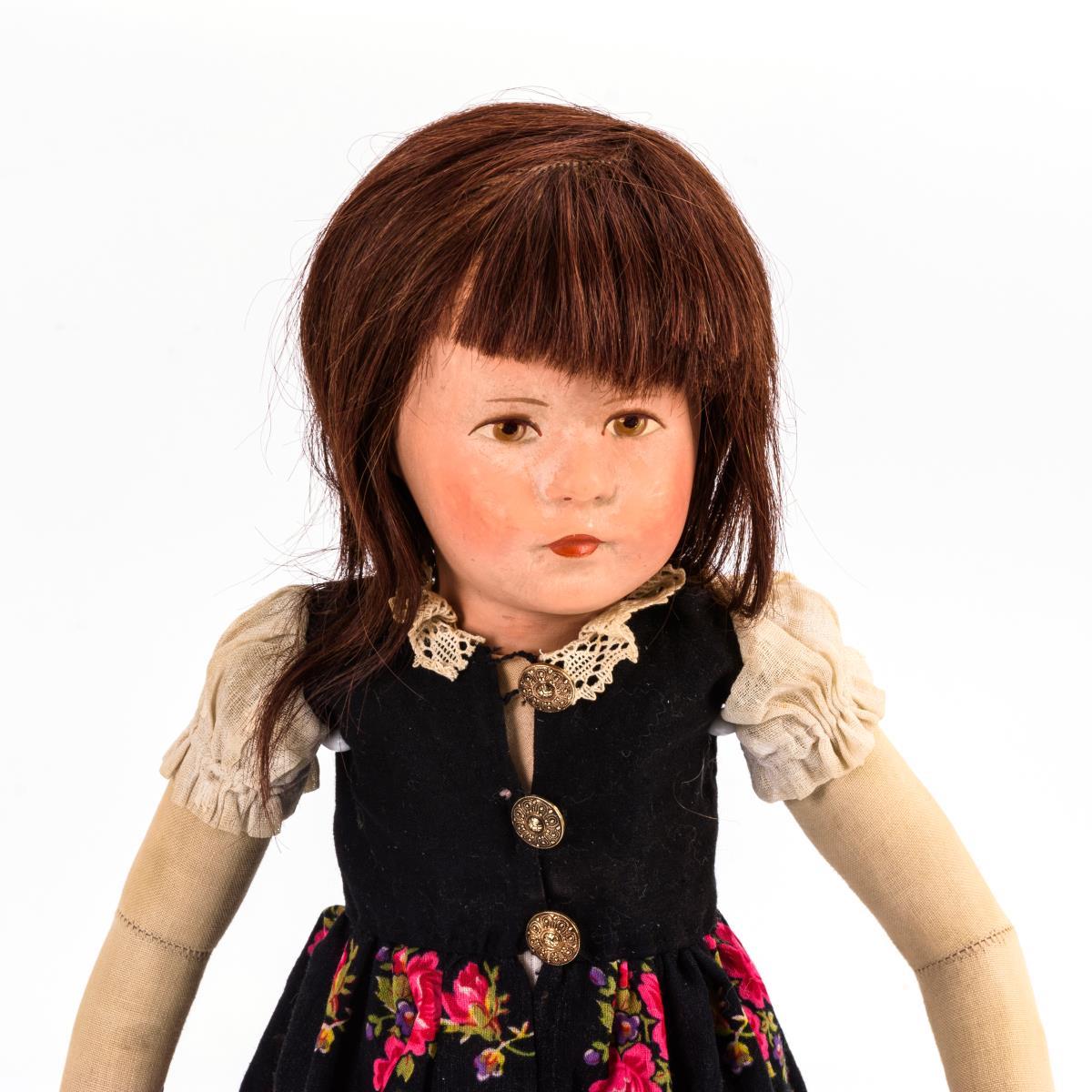 Kurbelkopf, gemalte braune Augen, dunkelbraune Echthaarperücke. Heller Stoffkörper. Schwarzes Dirndl mit rotem Blumenmuster, weiße Kunststoffschuhe. Gesicht partiell berieben, Körper leicht verschmutzt.