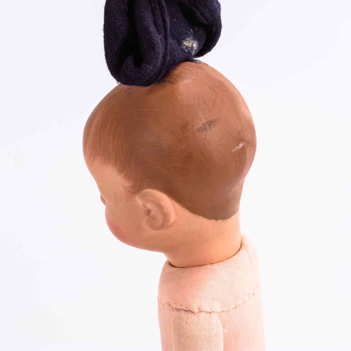 Beide mit Kurbelkopf (Mädchen: Kunststoff, Junge: wohl Stoffkopf), gemalten braunen Augen und Stoffkörper. Junge mit gemalten Haaren und festgeklebter Baskenmütze, Mädchen mit blonder Echthaarperücke und orange gemustertem Kleid. Bespielt, Altersspuren. Gesicht des Mädchens berieben, Körper verschmutzt.