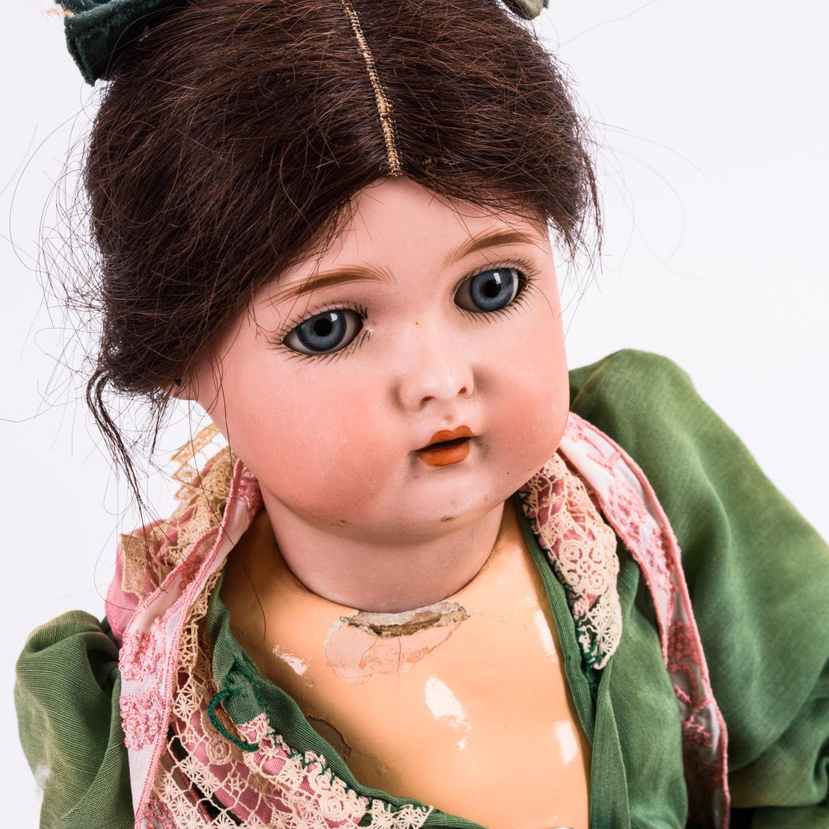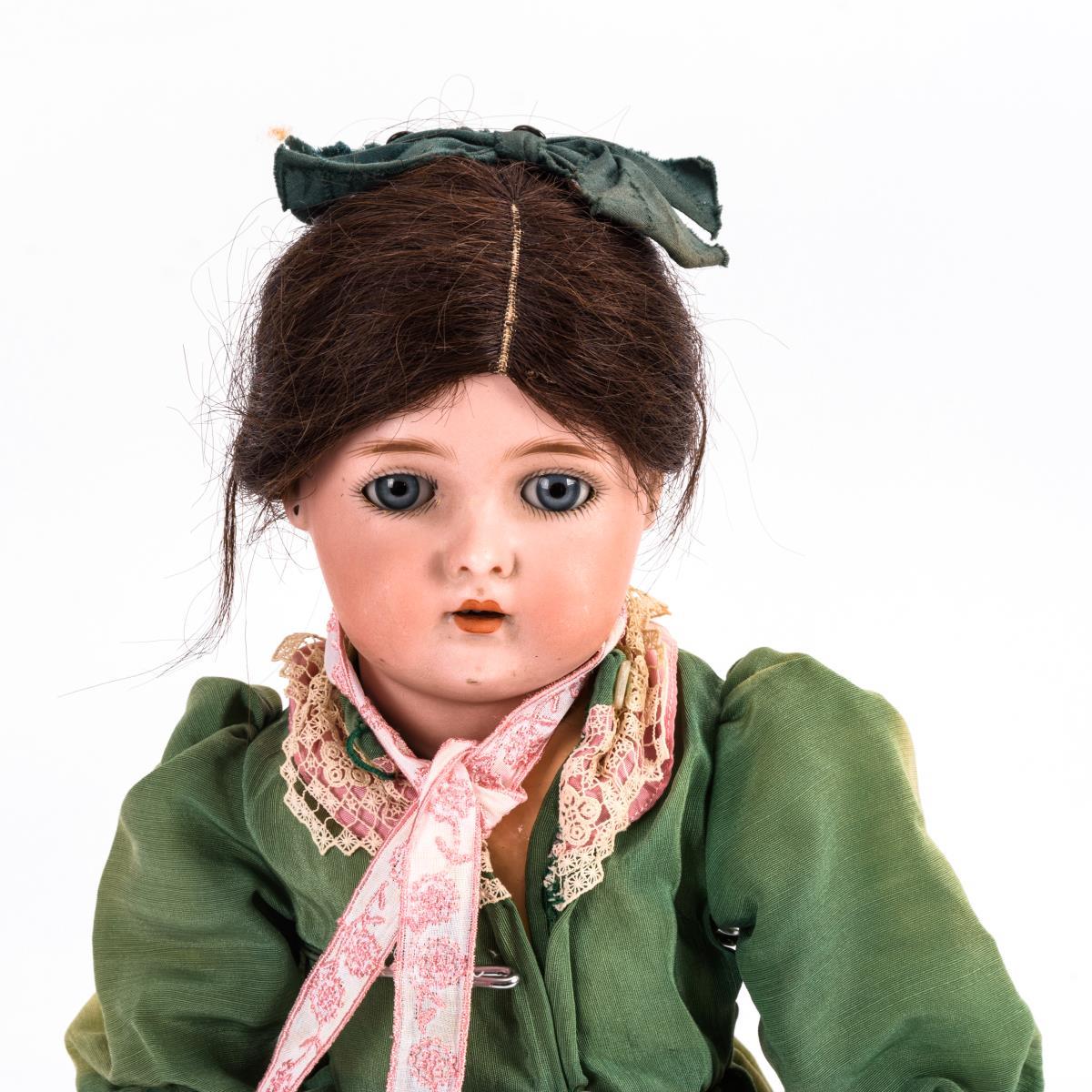 Kurbelkopf, blaue Schlafaugen, offener Mund, Ohrlöcher, braune Echthaarperücke. 15-teiliger Gliederkörper. Grünes Kleid, neue schwarze Schuhe. Brandriss hinter dem rechten Ohr, sowie sehr feiner, kaum sichtbarer Haarriss. Körper übermalt, mit Farbabplatzern.