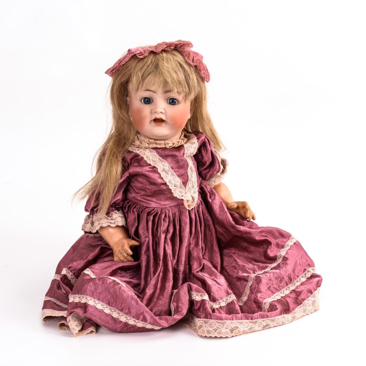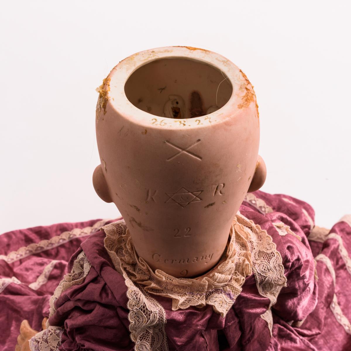 Kurbelkopf, blaue Schlafaugen, offener Mund. 5-teiliger Stehbabykörper mit geteiltem Torso und intakter Stimme. Altrosa Kleid und Haarschleife, braune Schuhe. Haarrissspinne am Hinterkopf, Zunge bestoßen.