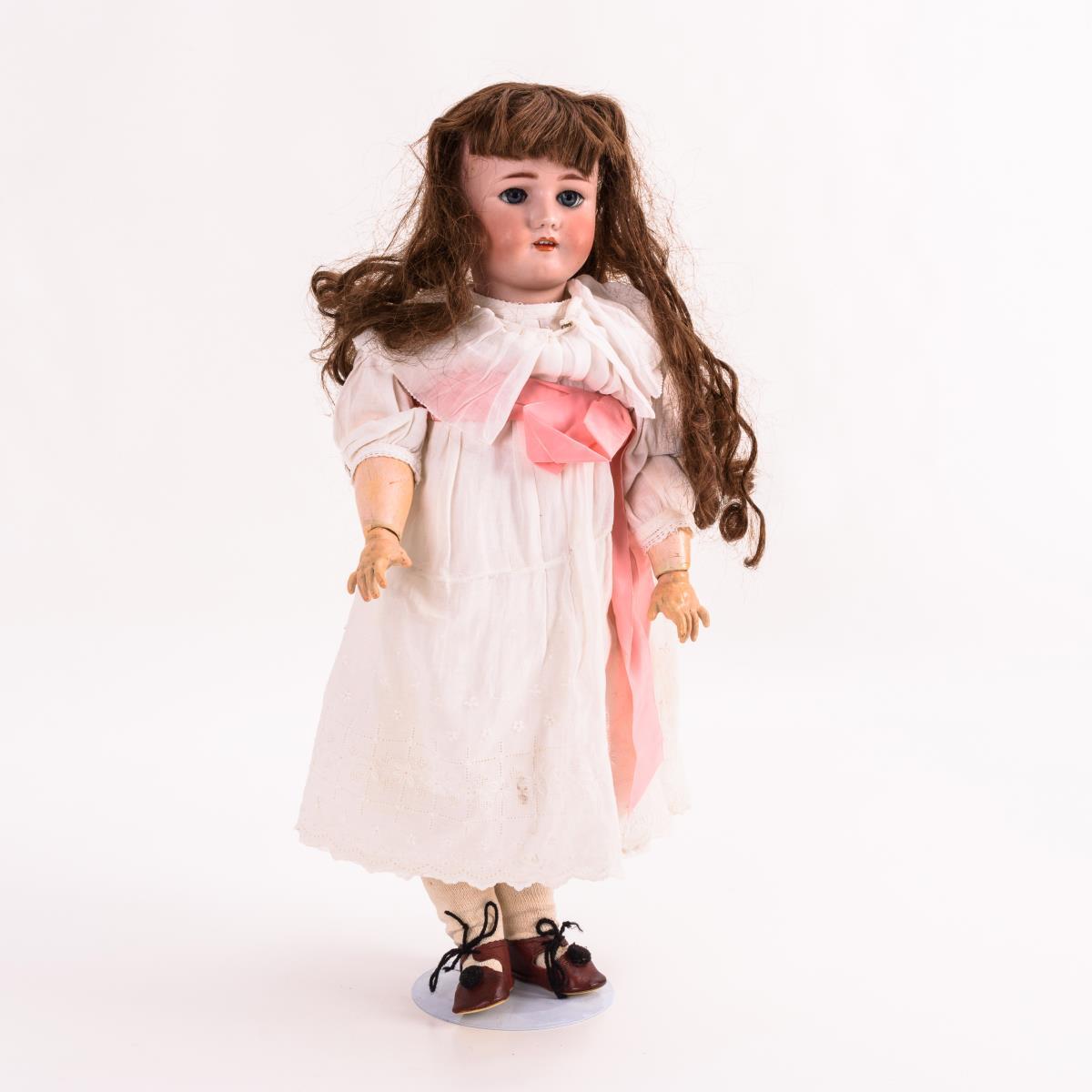 Kurbelkopf, blaue Schlafaugen, offener Mund, Ohrlöcher, lange braune Echthaarperücke. 17-teiliger Gliederkörper. Weißes Kleid, rosa Schärpe, weinrote Schuhe. 1 Chip an der Kopfkrone. Körper mit Farbdefekten, partiell übermalt.