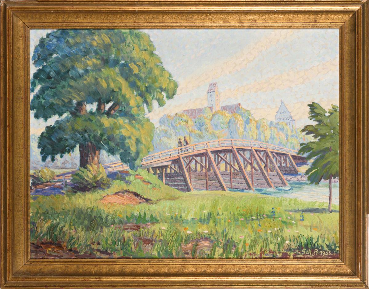 Monogrammist "Sch R": Wanderer auf Holzbrücke vor Schloss