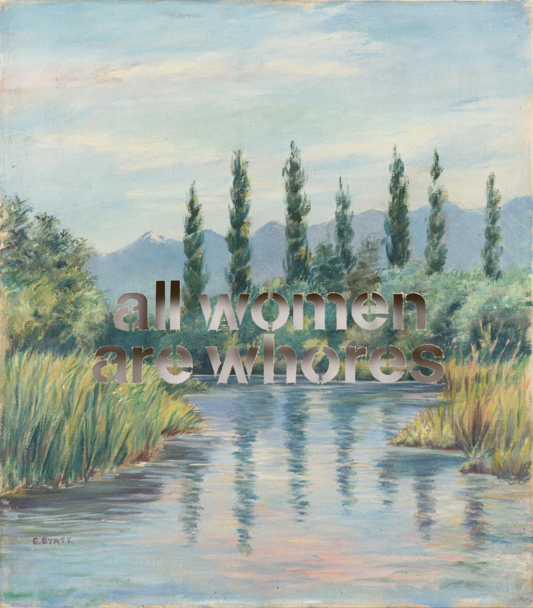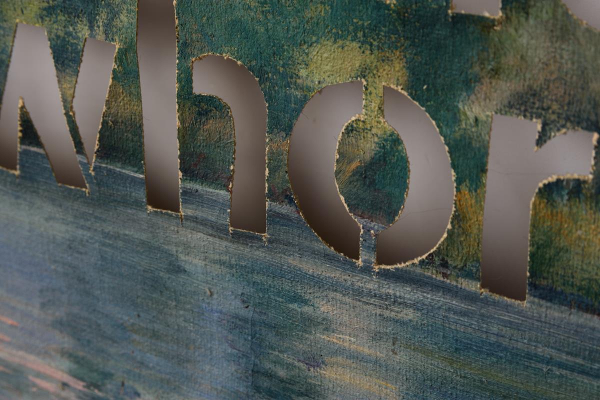 Landschaftsgemälde des frühen 20. Jahrhunderts, aus dem die titelgebenden Buchstaben geschnitten wurden.