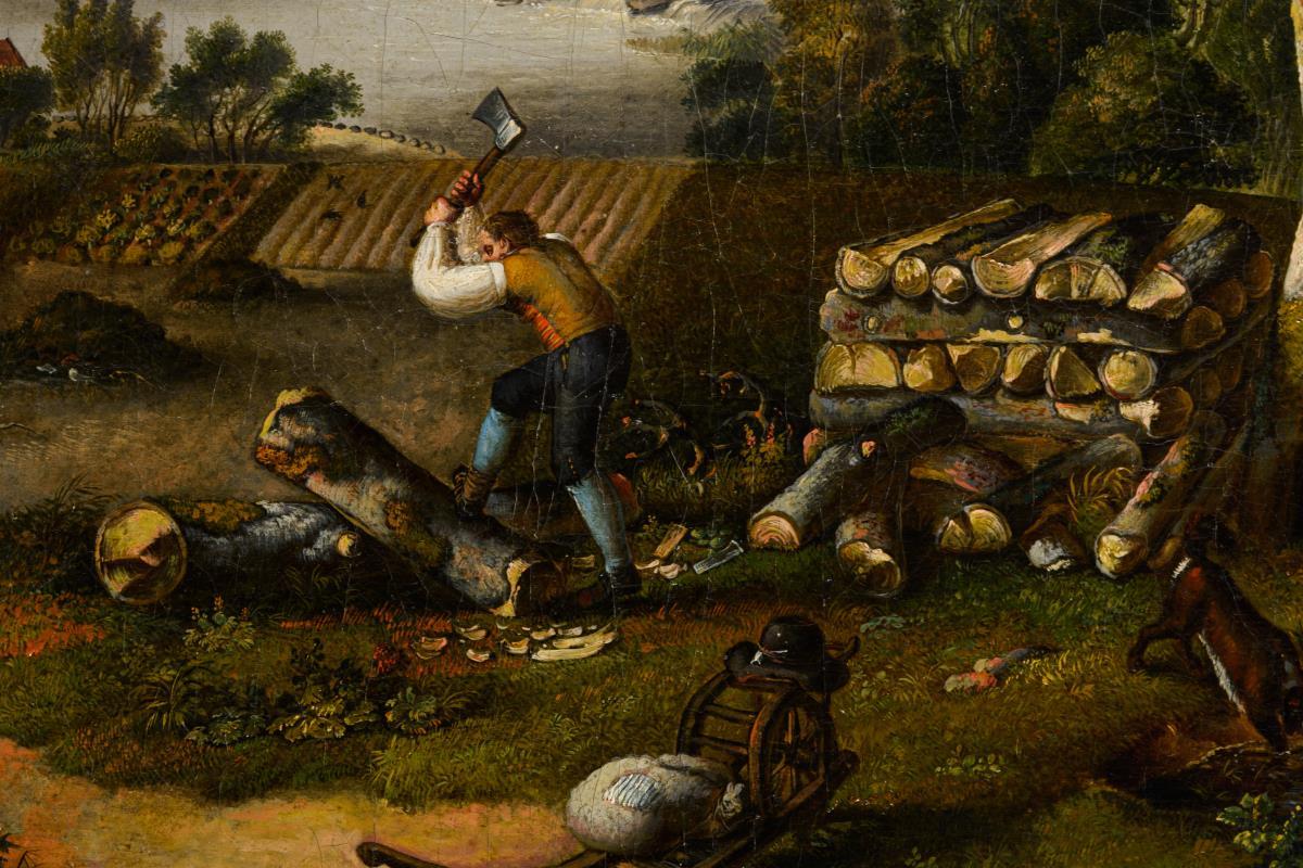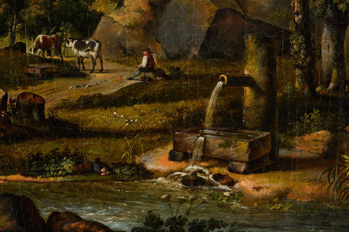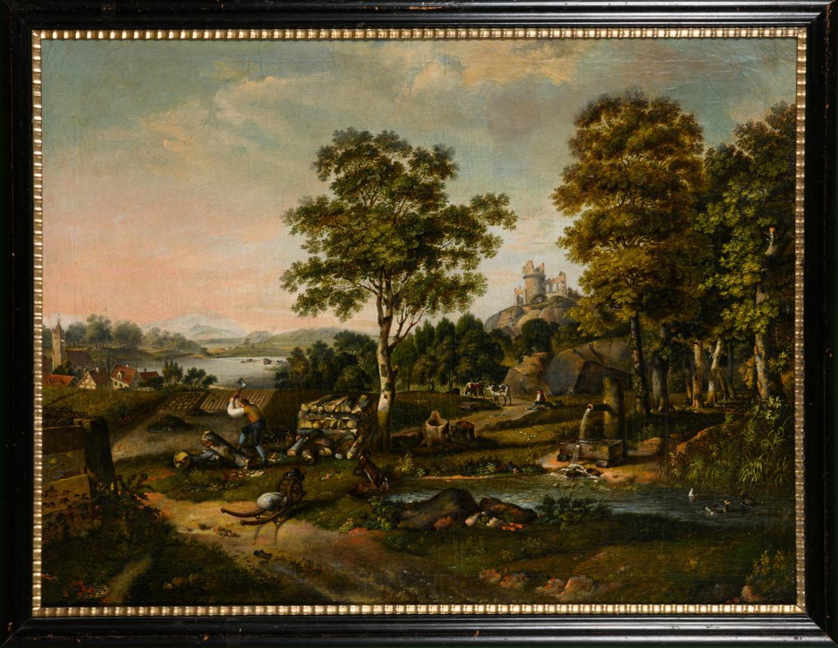 Der Holzfäller bei der Arbeit nahe einem Teich und einem Hirten mit Rindern in bergiger Landschaft nahe einer Ruine. Leinwand randdoubliert.