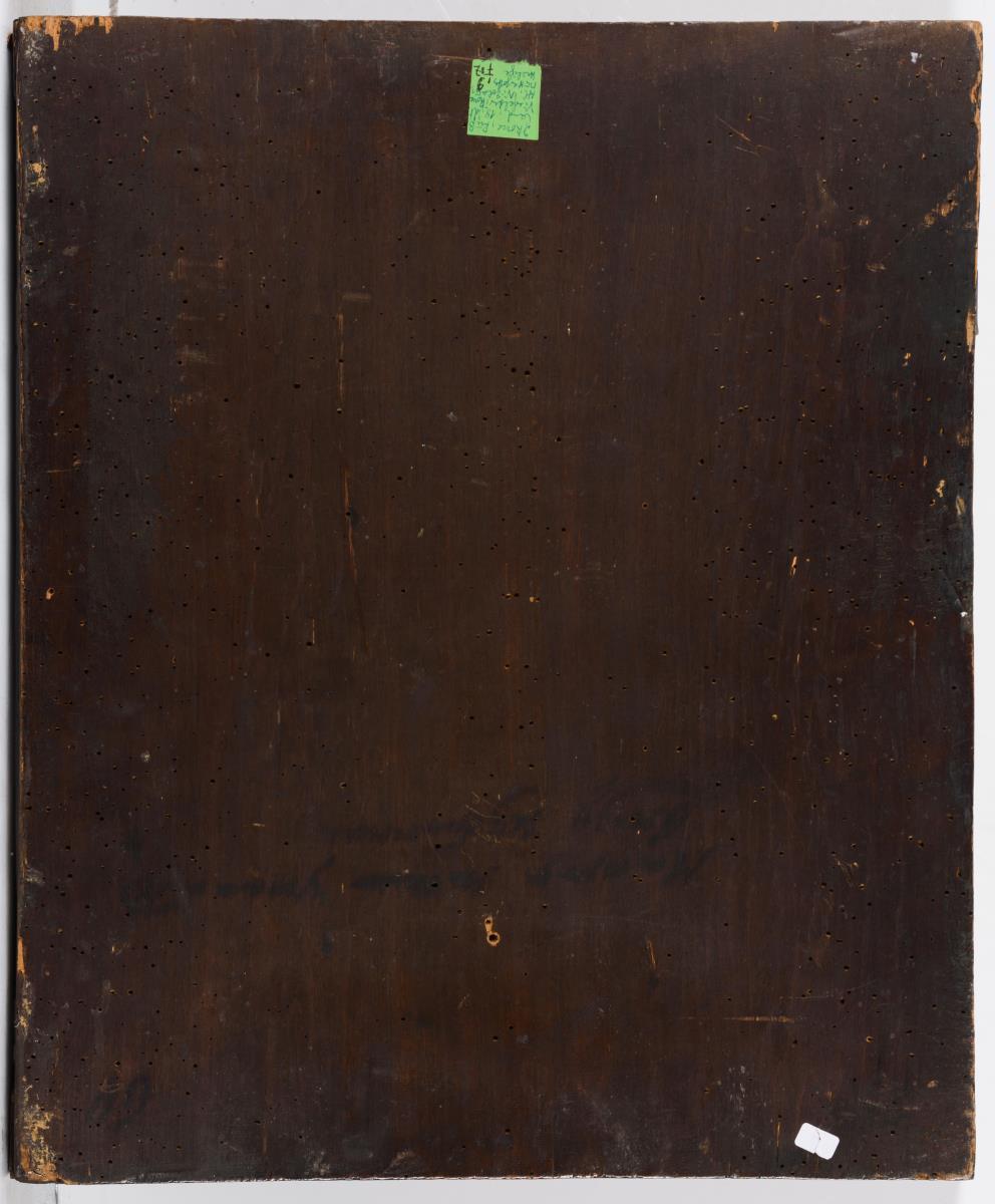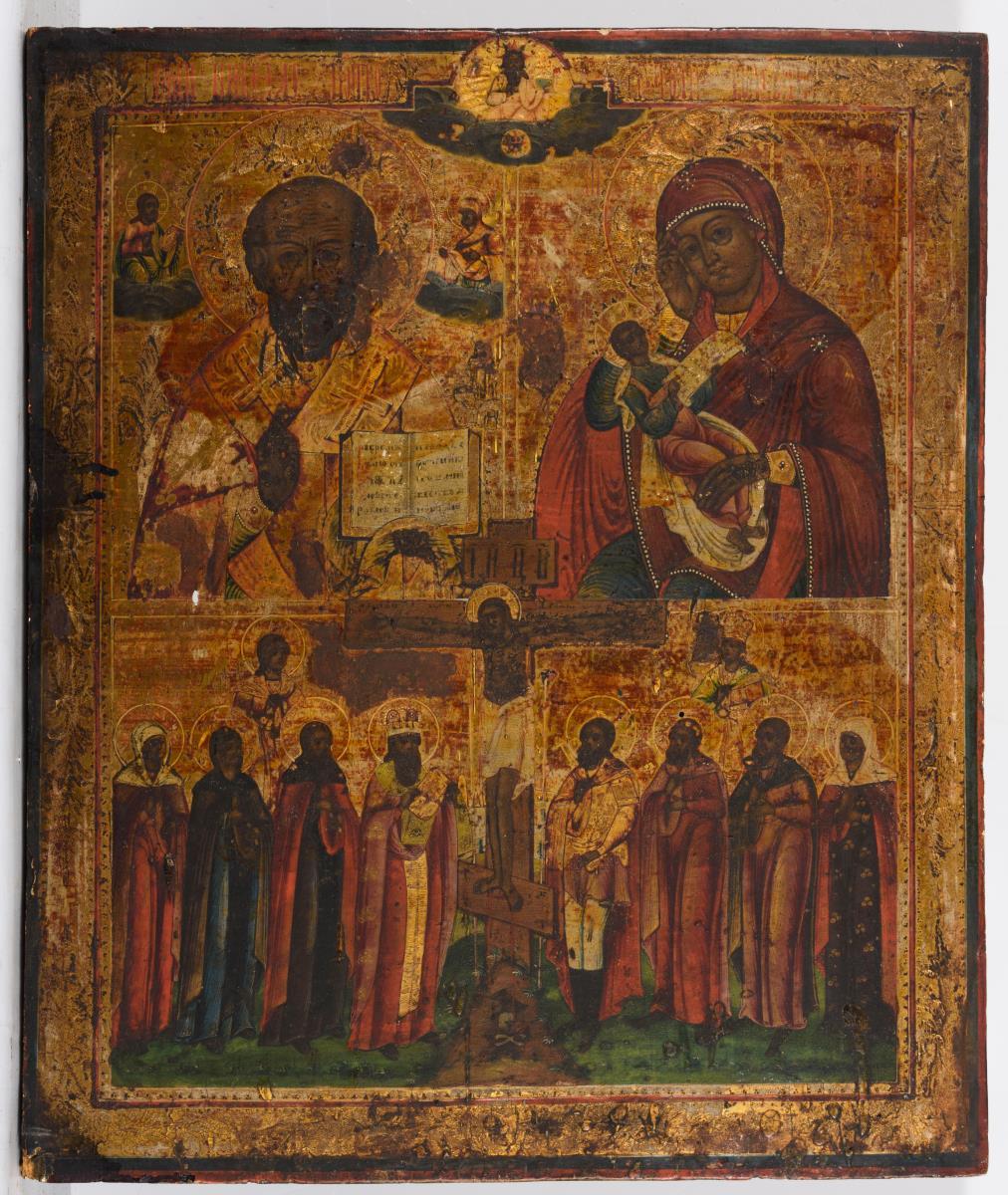 Maria mit Kind sowie der Heilige Nikolaus oberhalb der Kreuzigungsszene. Altersspuren.