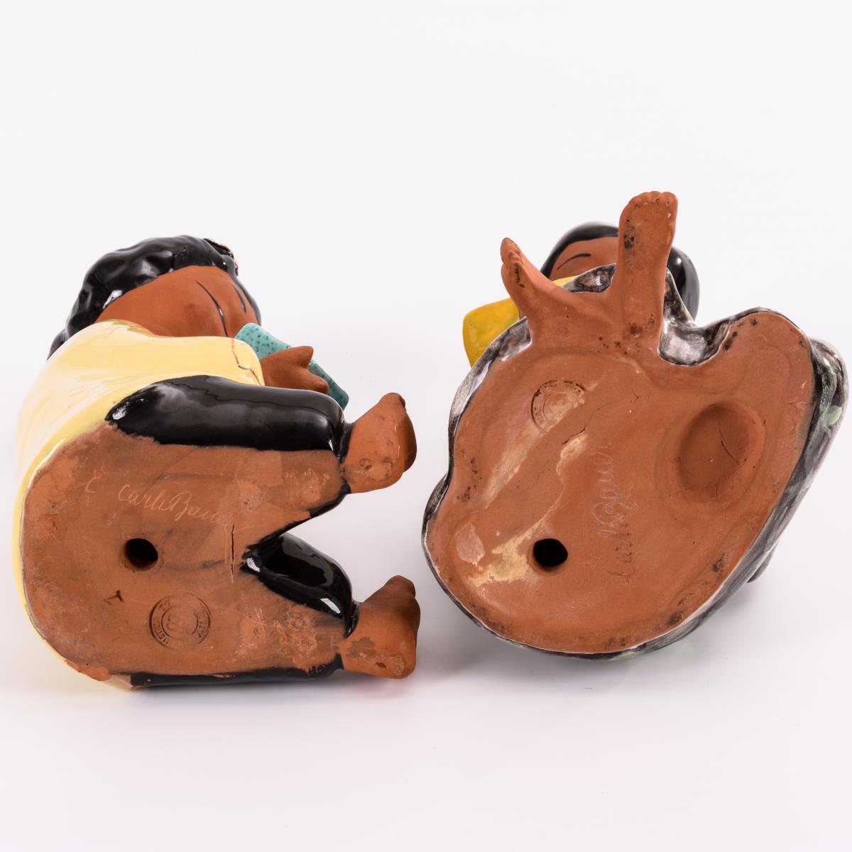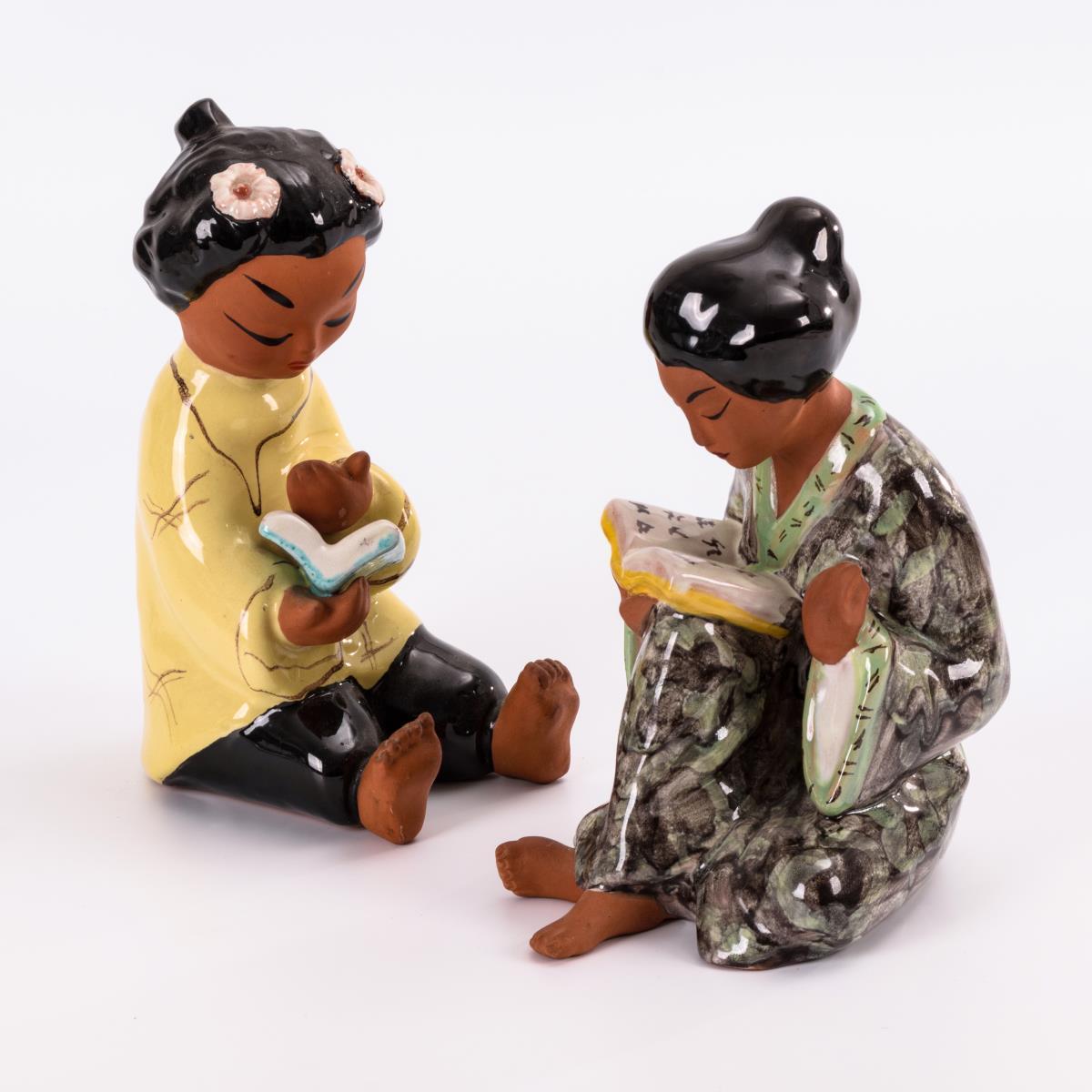 Verschieden gestaltet, jeweils in einem Buch lesend. Glasurchips.