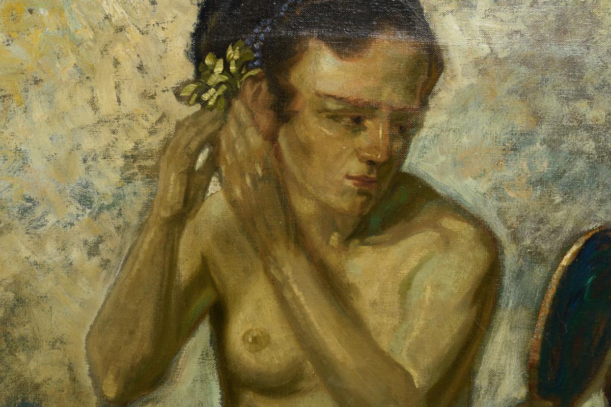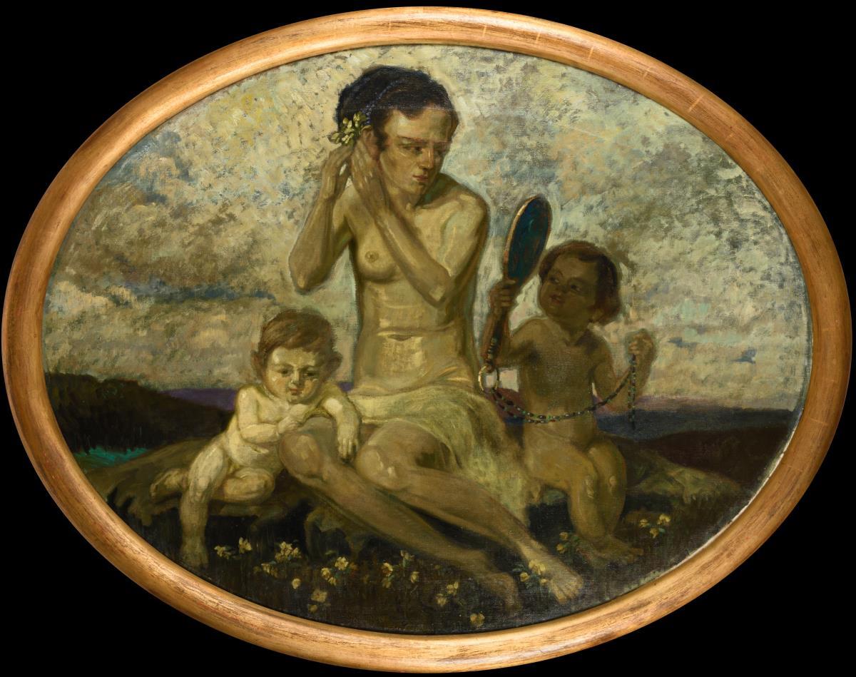 Junge Frau mit zwei Kindern beim Anlegen von Blumenschmuck im Haar, während eines der Kinder den Spiegel hält. Eine kleine restaurierte Stelle mit Hinterklebung.