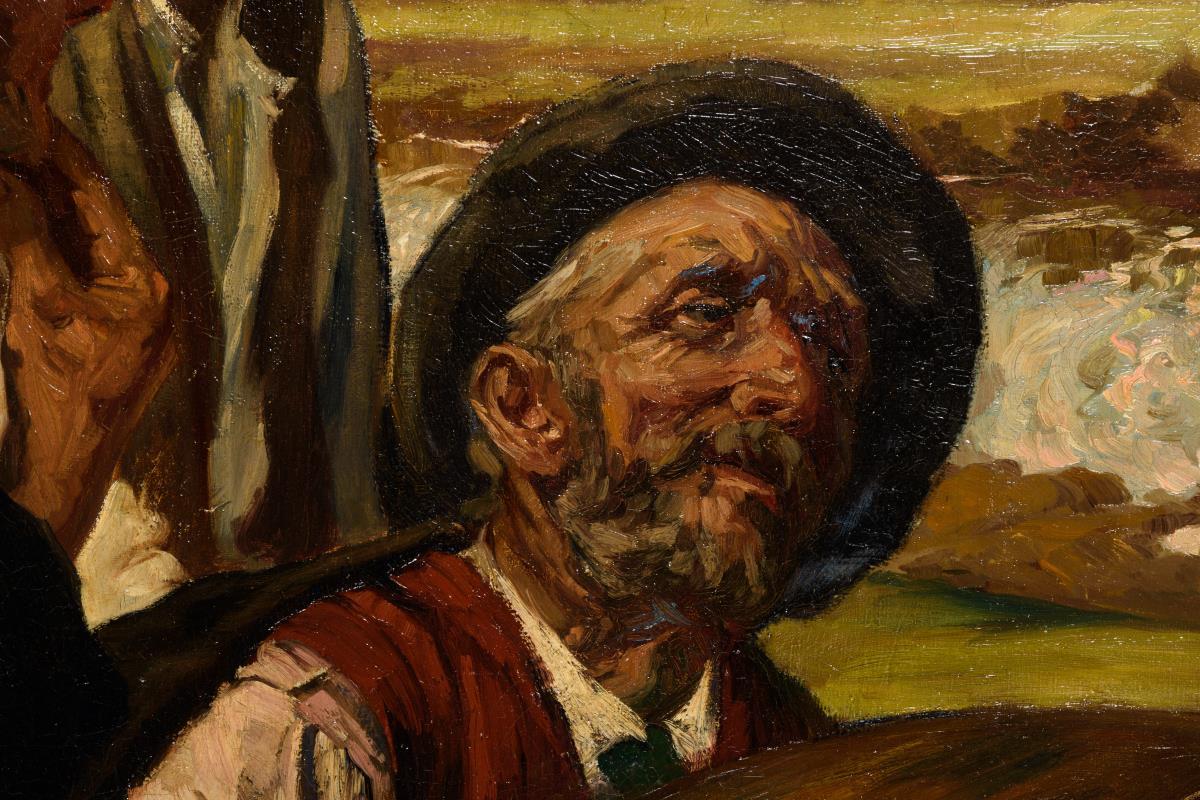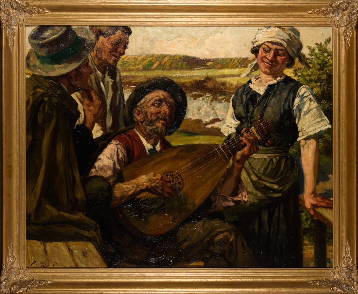 Alter Lautenspieler mit begeisterten Zuhörern auf einer Terrasse vor weiter Felderlandschaft. Eine restaurierte Stelle.