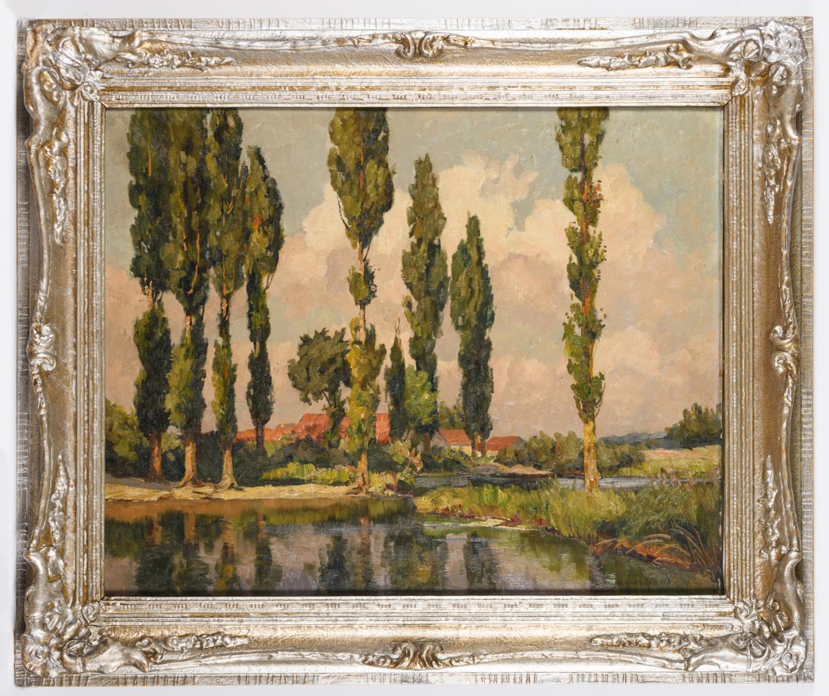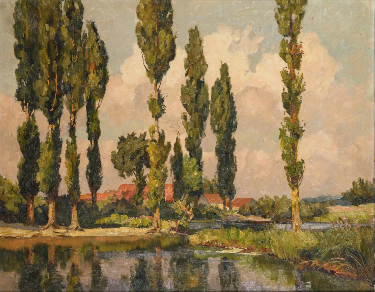 Blick vom See zu den Dorfhäusern zwischen den Pappeln.
