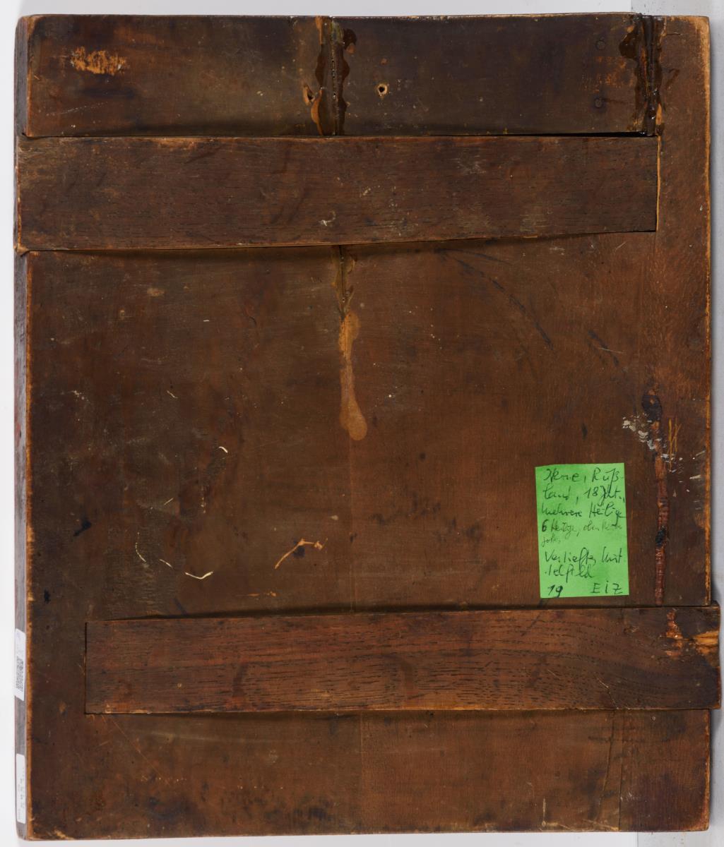 Sechs Heilige vor einem Marienbildnis. Altersspuren.