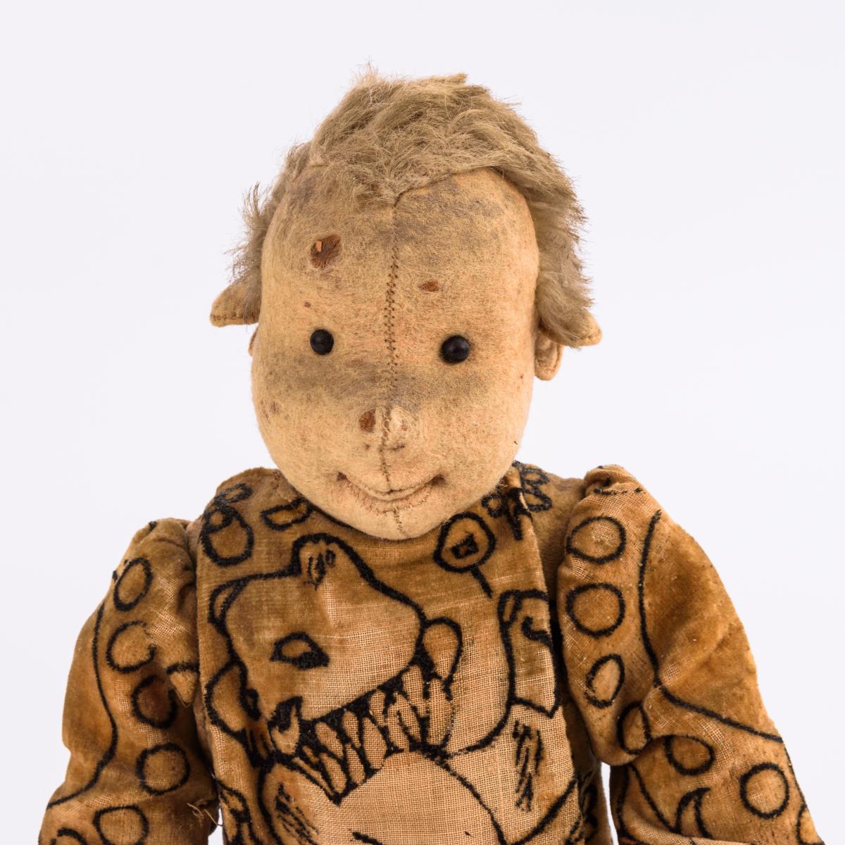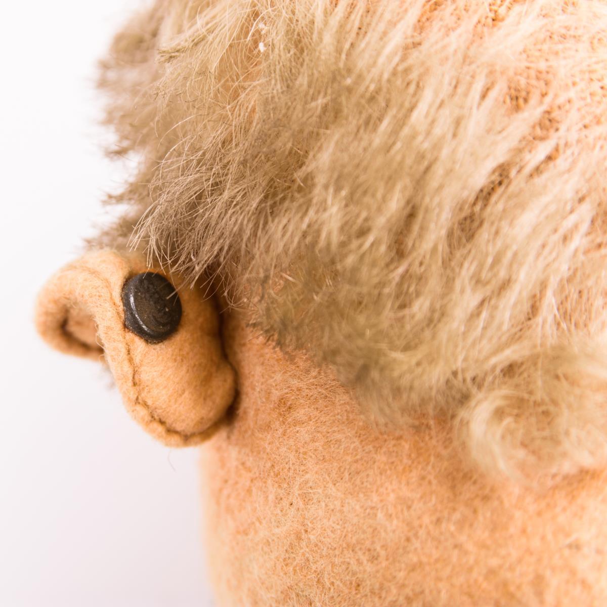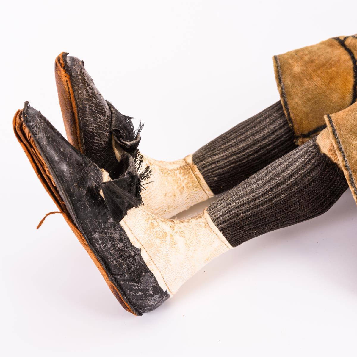 Clownfigur aus der Steiff-Zirkusserie, in Samtanzug und großen schwarzen Lederschuhen mit Schleife. Altersspuren, kleine Defekte, Farbe stark verblichen, Hut fehlt.