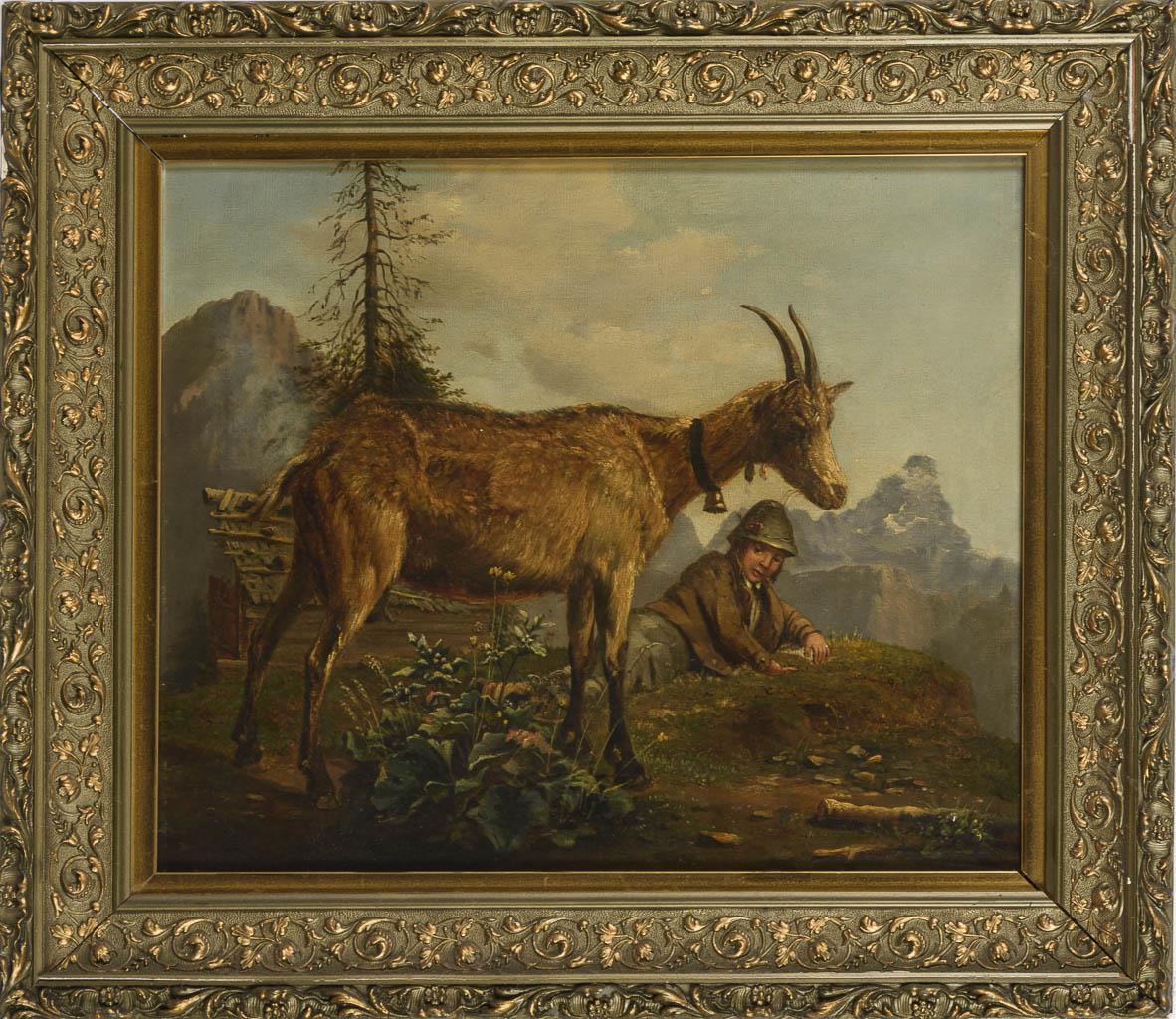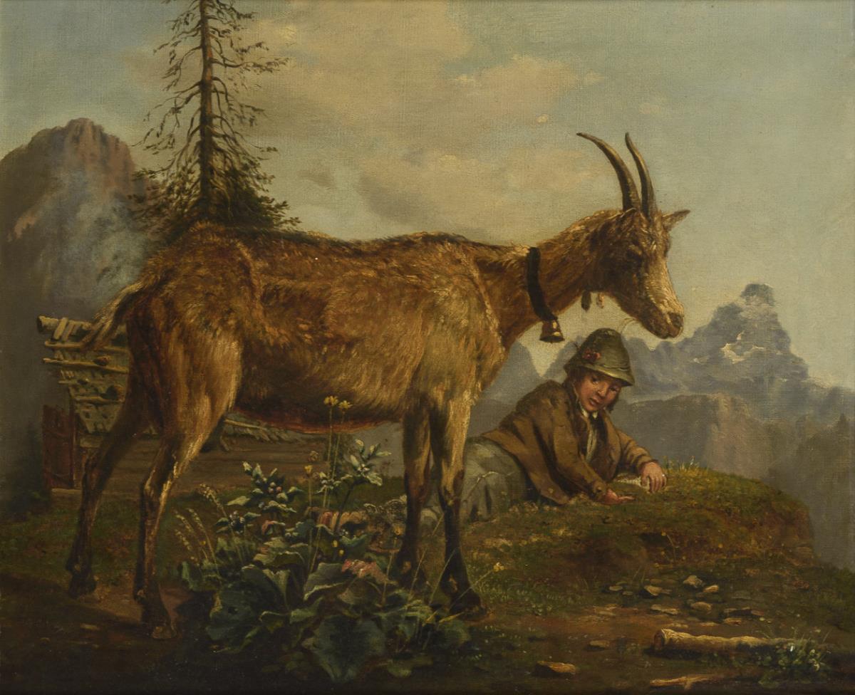 Die Ziege mit Halsglocke im Bildzentrum auf einem Bergvorsprung, vor dessen Abgrund ein Junge im Gras liegt, während im Hintergrund eine Hütte vor den Gipfeln zu sehen ist. Leinwand doubliert.