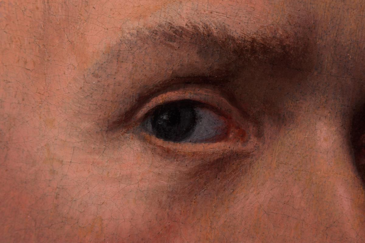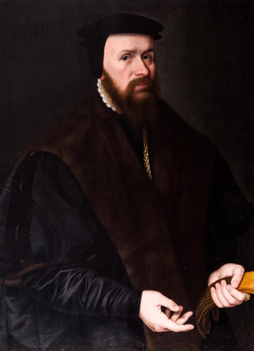 Öl/Leinwand. Unsigniert, links oben Datierung mit Zusatz "Aetatis 42", verso auf Doublierleinwand falsche Zuschreibung des Dargestellten. Datiert: 1562.