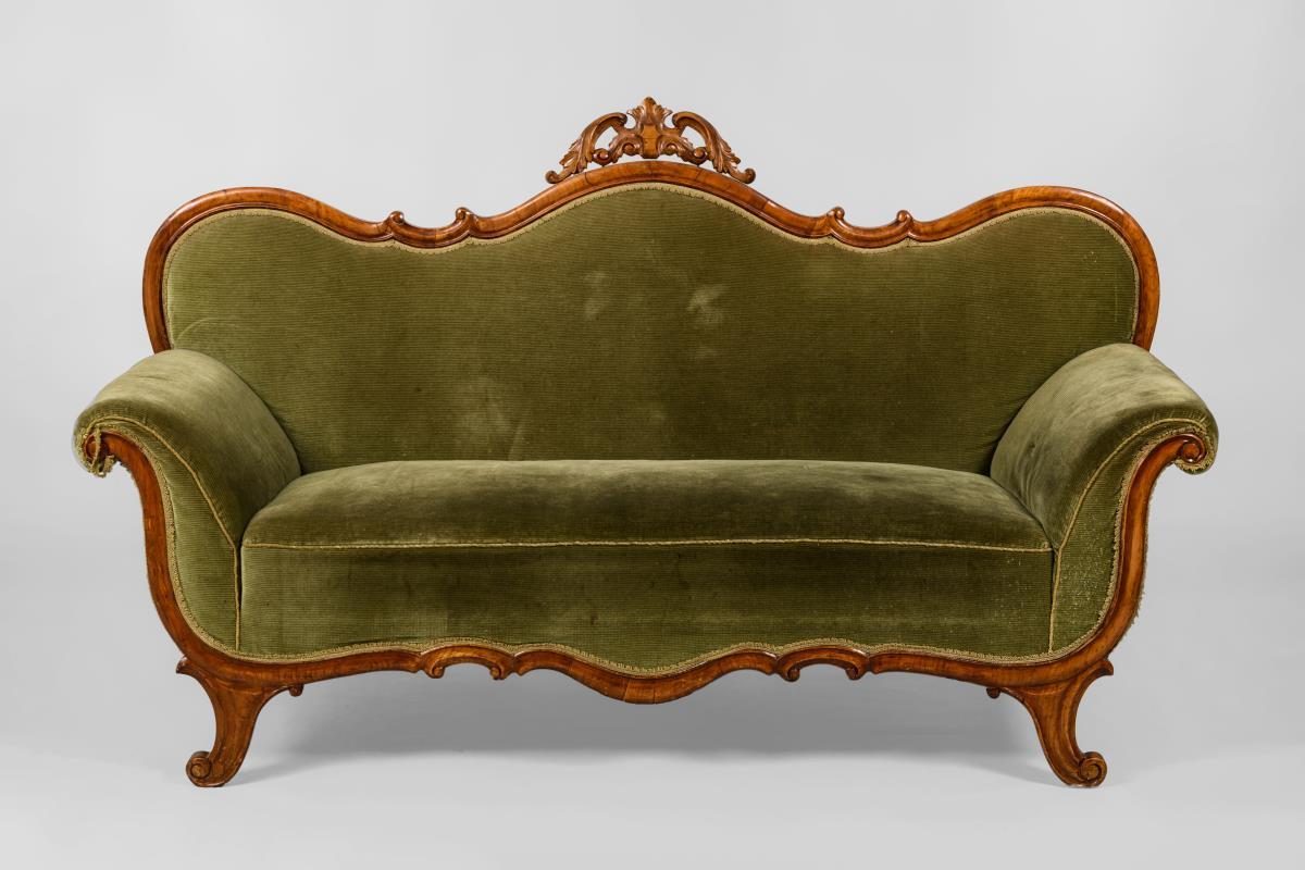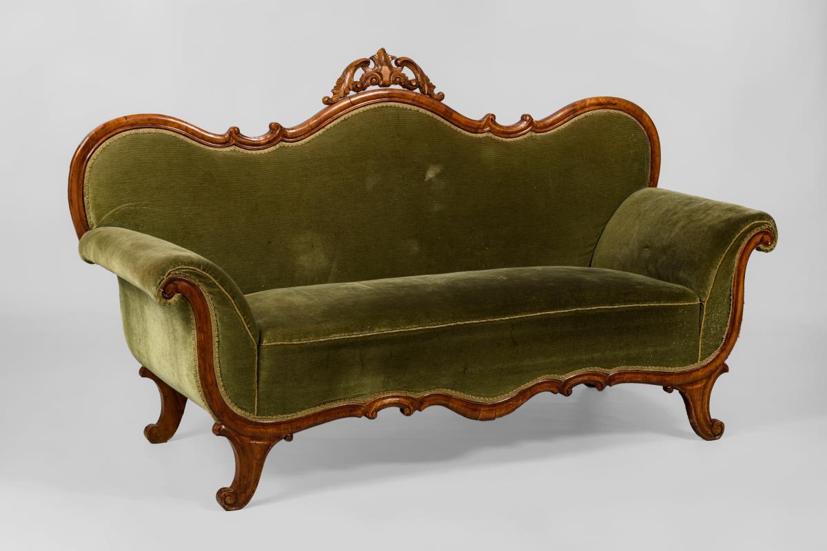 Polstersofa in geschwungener Form, mit geschnitzter Bekrönung, volutierten Armlehnen und Füßen. Grüner Samtbezug. Alters-/Gebrauchsspuren, restauriert, inaktiver Anobienbefall, Polster und Bezug ergänzt, Bezug etwas fleckig.