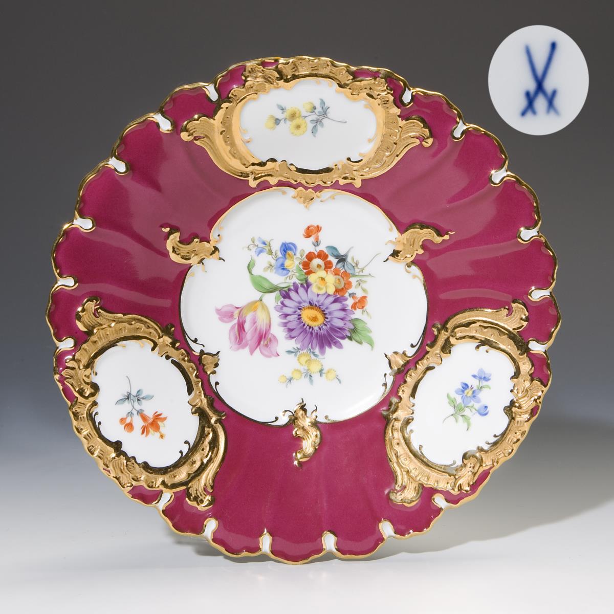 Modell von Ernst August Leuteritz 1863. Reliefiert, gold staffiert, mattiert und poliert. Purpur-Fond, farbige Blumenbemalung mit Buketts und Einzelblüten. Pressmarke, Malermarke, Schwertermarke.
