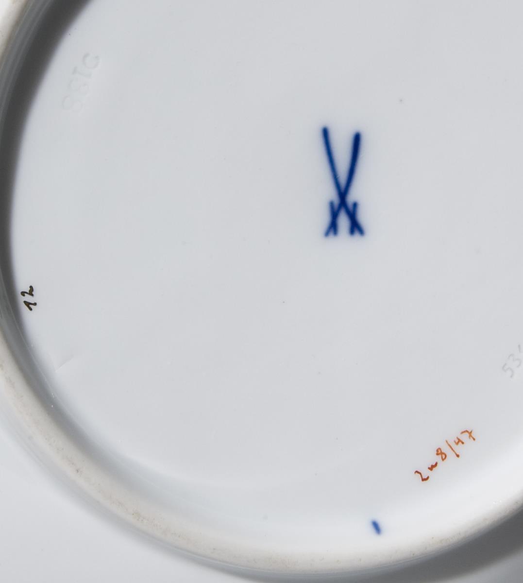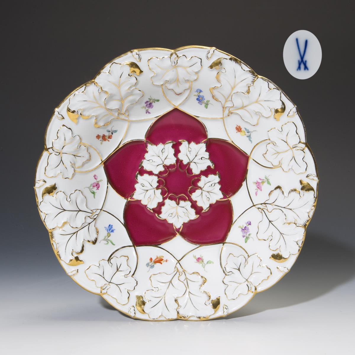 Modell von Ernst August Leuteritz 1855-1860. Floral reliefiert, gold staffiert, partiell Purpur-Fond. Farbige florale Bemalung. Pressmarken, Malermarken, Schwertermarke.